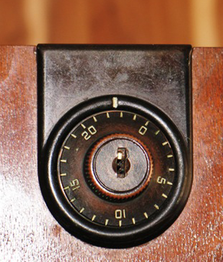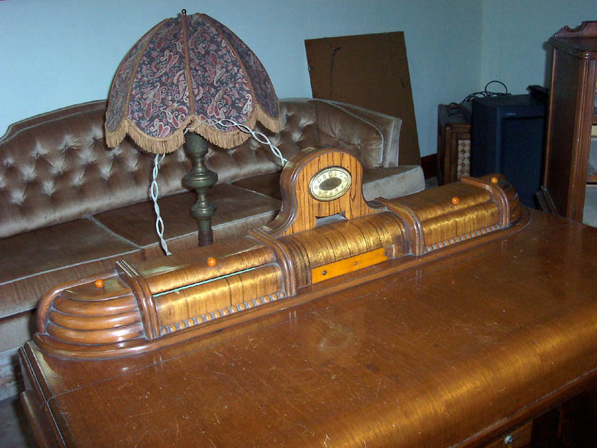Identifying Marks Some Forensic Evidence Probably from the late 1930s Click to Enlarge Offhand, because of the side drawer, the combination lock, brass "badge" and the extensive veneer treatment, I would put this in the mid- to late 1930s. At that time, fountain pens were a personal statement, much like cellphones are more than telephones. The ballpoint pen is from the 1950s, but the unusual phone number for the Humble station indicates that the owner lived in (or visited) a small town in the Southwest. Check out our Telephone Page for more details on early telephone numbers. These pictures were sent in by our reader April, who writes: "... I found this at a second hand store. It still had card that you fill out and mail back to Cavalier for [the presentation] plaque. It was a graduation gift from 1961 ... still has the ..."