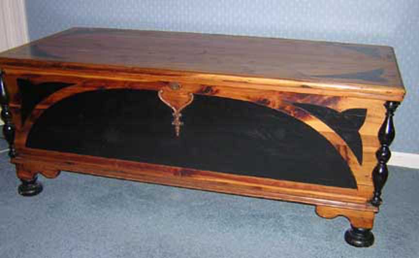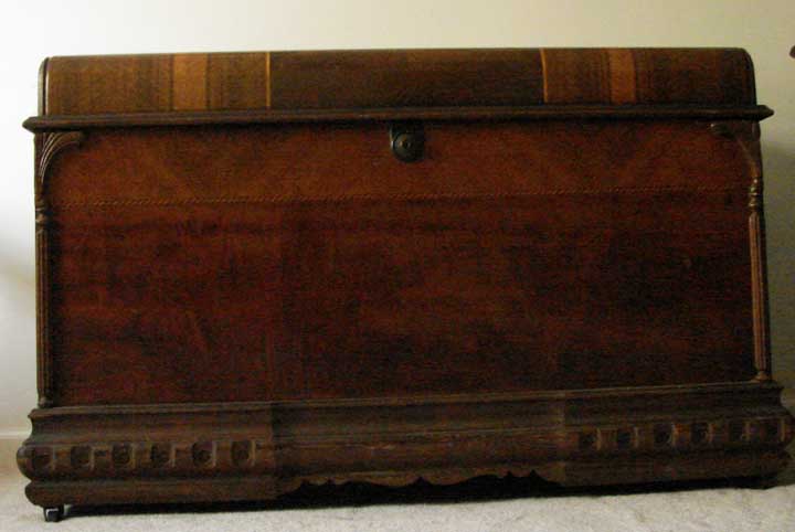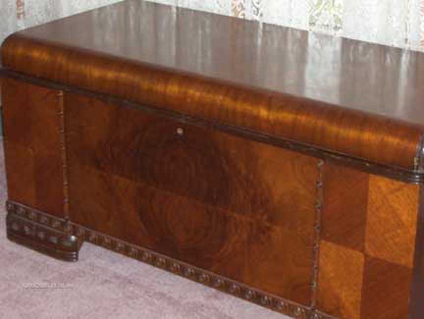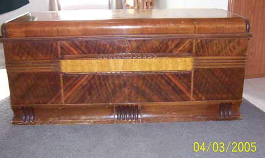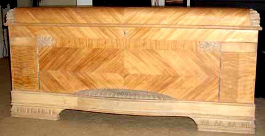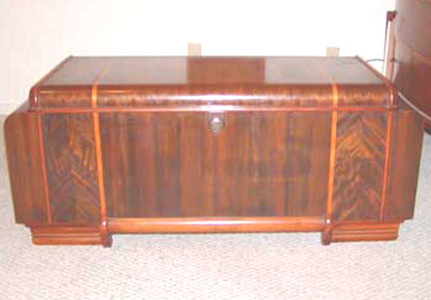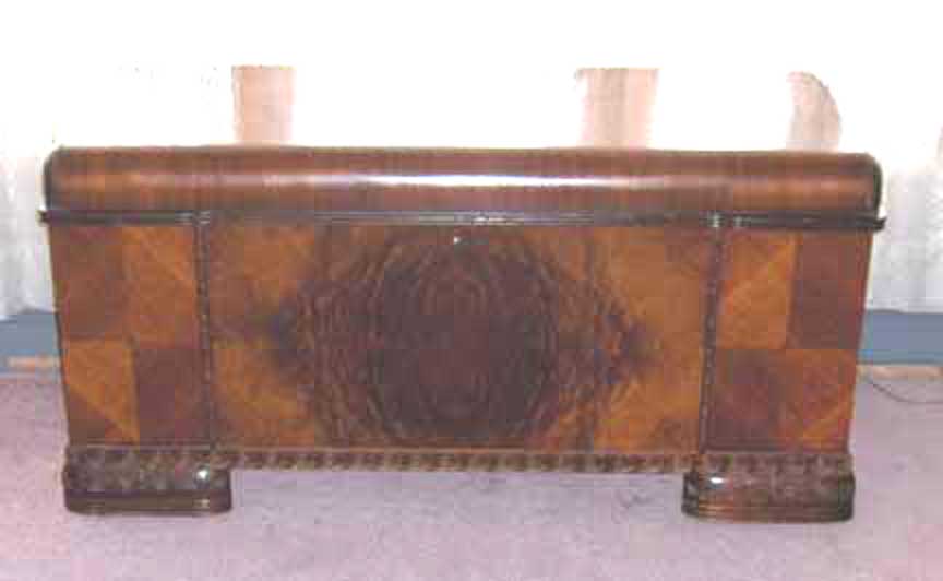 Unknown Maker Waterfall Cedar Chest Great veneer detail Click to Enlarge We got these photos from our friend Waynette who lives in Tennessee. She writes: ".... Just wanted to share pictures of a chest that was given to me a few years ago. It could stand to be refinished but hate to erase its old beauty. I have only been in Tennessee three years and love it. I got the chest in Rhode Island not knowing I was taking it so close to its original home ..."