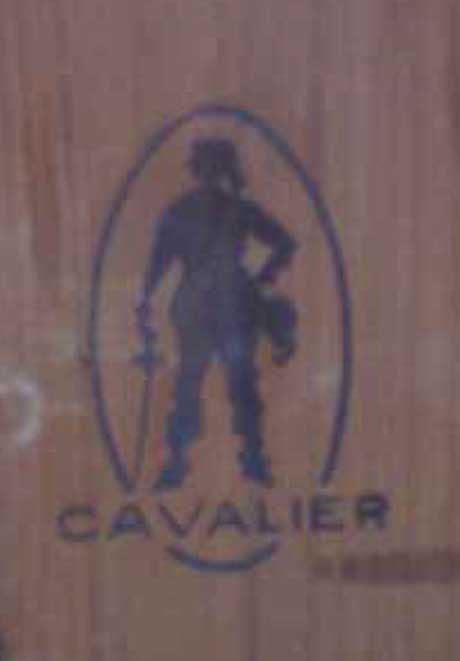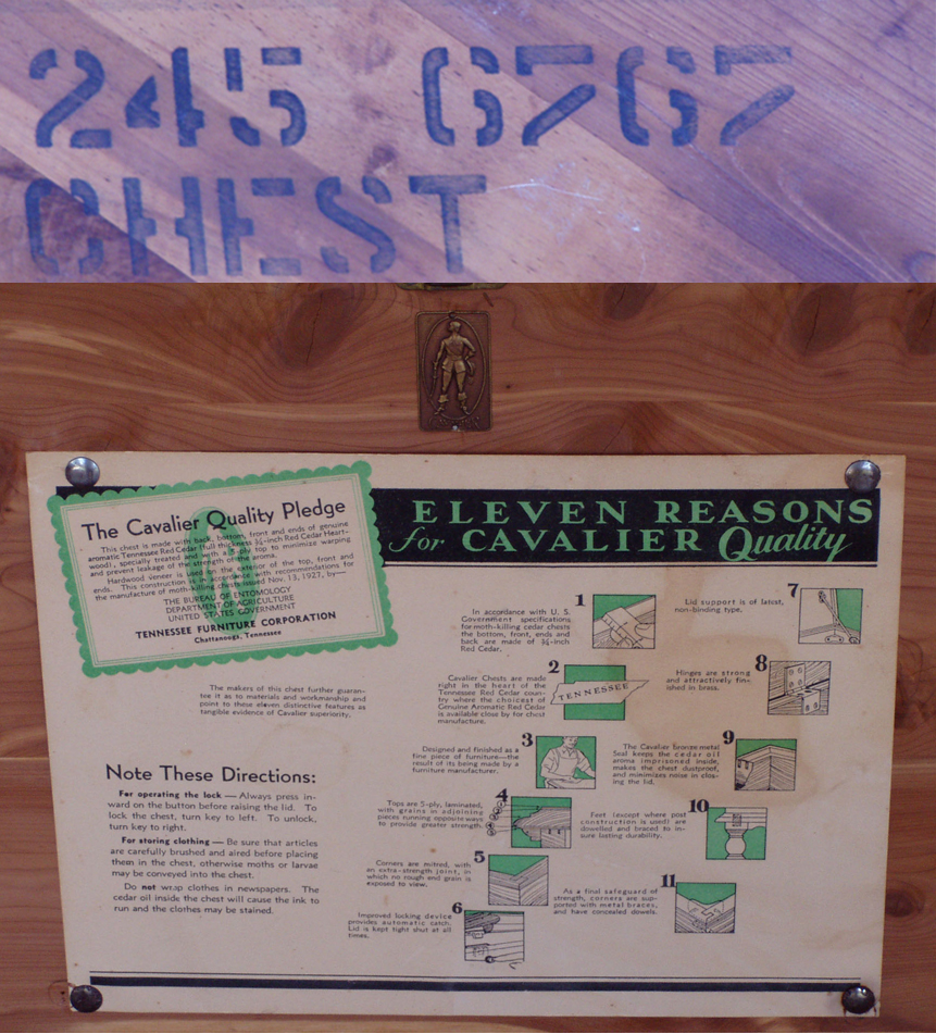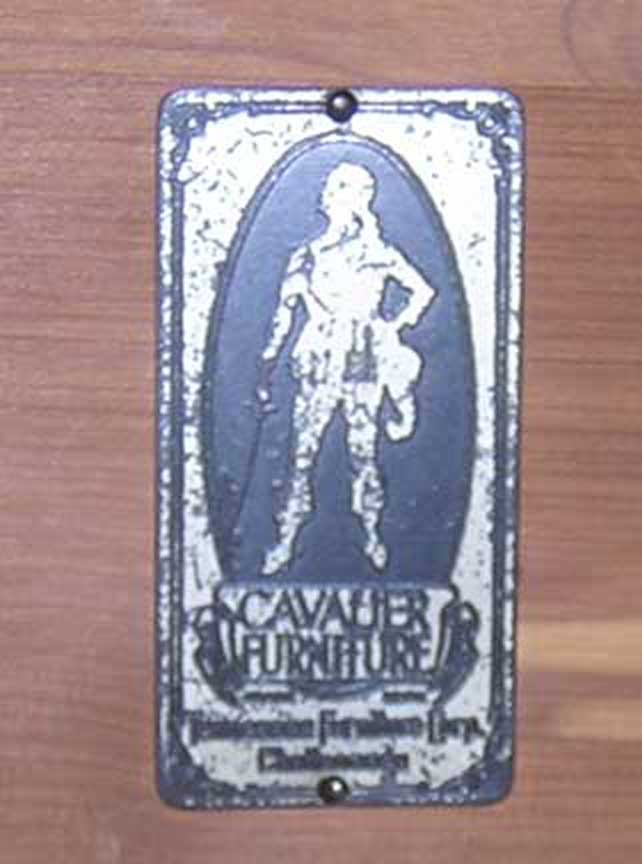 Jenifer's 1920s Cavalier Cedar Chest Click to Enlarge Here are some photos sent in by Jerry from Berkeley California. He writes:: "...I recently aquired this cedar chest from a relative and I am wondering if you can help date it for me?.....It seems to be solid cedar with a dark walnut stain on the outside. It has a small metal tag on the inside of the top that says 'Cavalier' and has an image of a cavalier on it. I am sending 5 photos that will show you what it looks like. It is not in the waterfall style. To me it looks older. One of the photos is of the bottom showing a number and 'WAL' which I assume indicates the walnut stain..."