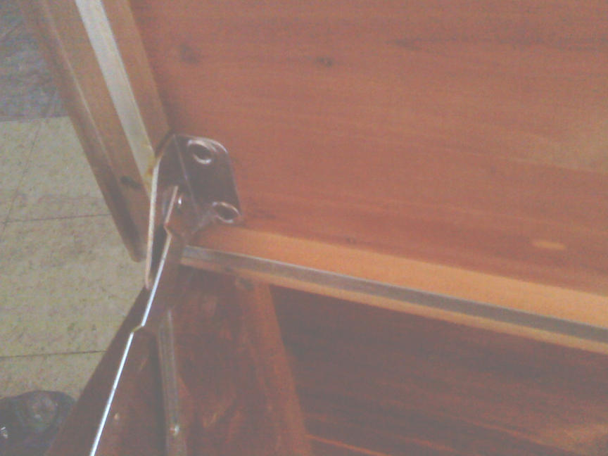 Craig's Cavalier Cedar Chest Unique Side Compartments Click to Enlarge This is truly a marvelous cedar chest. The veneer work suggests a steamer trunk and we have never seen the side compartments. A very nice piece of furniture. Congratulations to Craig and a tribute to his Great Aunt. In early 2011, Tom sent us some photos of an unusual waterfall cedar chest that he was restoring. He writes: "... here are a few pics of a Cavalier Cedar Chest that I am in the process of repairing/restoring and collecting some information about it along the way. The one really odd feature on this chest is the wood hinges. Sadly, both are broken, but I have not seen a single example of one being original to Cavalier chests. Perhaps you have seen one? Anyway, enjoy these pictures. As the project continues I will send you more ..." " found this video on the Internet from a place in Ohio called Old Wood Market Antique Shop which shows a chest that is remarkably like the one I have. It shows the inner shelf, which is missing in mine, and how it functions within the lid and body. It also shows that I would gather are the original hinges, not these weird wooden ones I have on the chest now..." Here are the photos of Tom's Cavalier Cedar Chest.