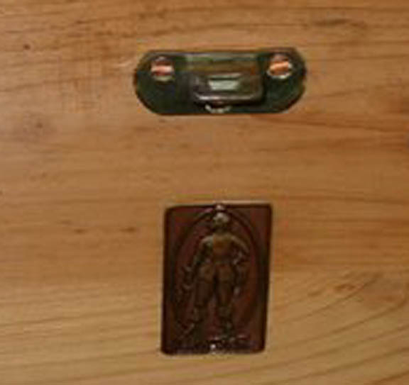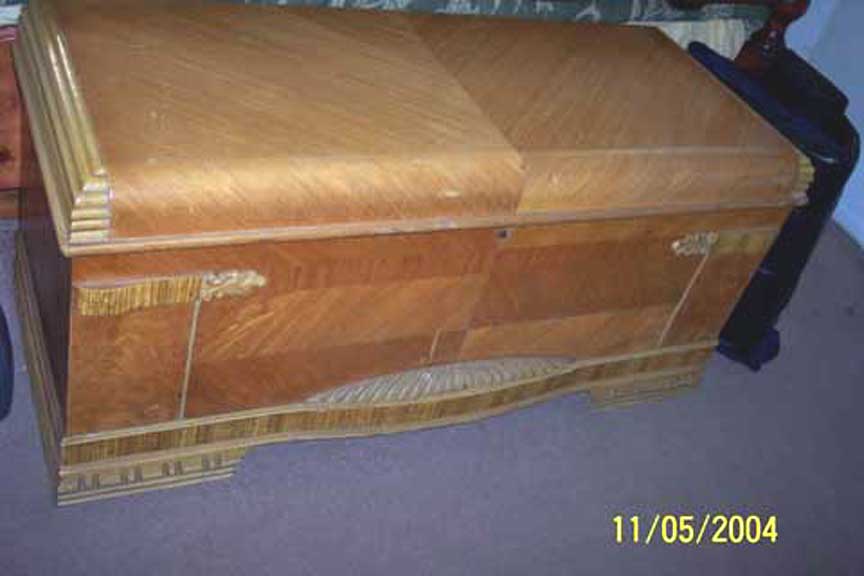 The Forlorn Cavalier Chest We hope that it has received some TLC since these photos were sent in 2003... Click to Enlarge Here are some more photos that were sent to me in November of 2004.They clearly illustrate the difficulty in assigning a date to an object by appearance alone. The first set shows a Waterfall (moderne) Cedar chest from the 1940s (as indicated by the brass badge). The secons set shows a cedar chest that is very similar that was made in the 1950s (as indicated by the woodburned makers mark).