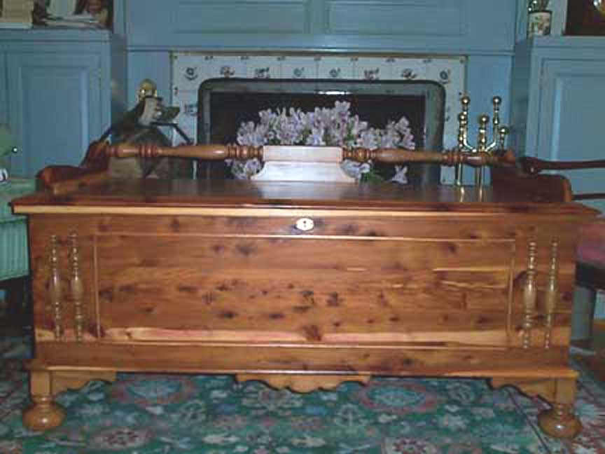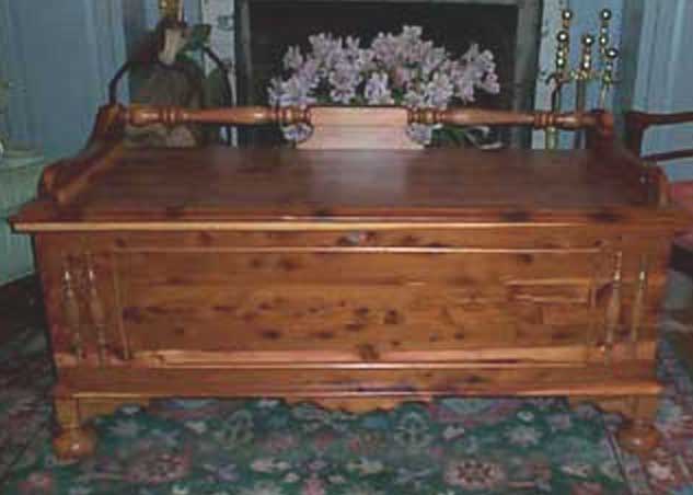 ![]() ![]() Kathy's New-Found Treasure Click to Enlarge Here is a most unusual chest. We have never seen a cedar chest combined with a hall-seat prior to a very nice letter from one of our readers. She writes: ".... I am sending a few pictures of a cavalier cedar chest that has been passed down to me. According to my grandmother, my great-grandmother bought it at an auction. I have no idea how old it is and have not seen any similar chests anywhere. It is an interesting piece and I