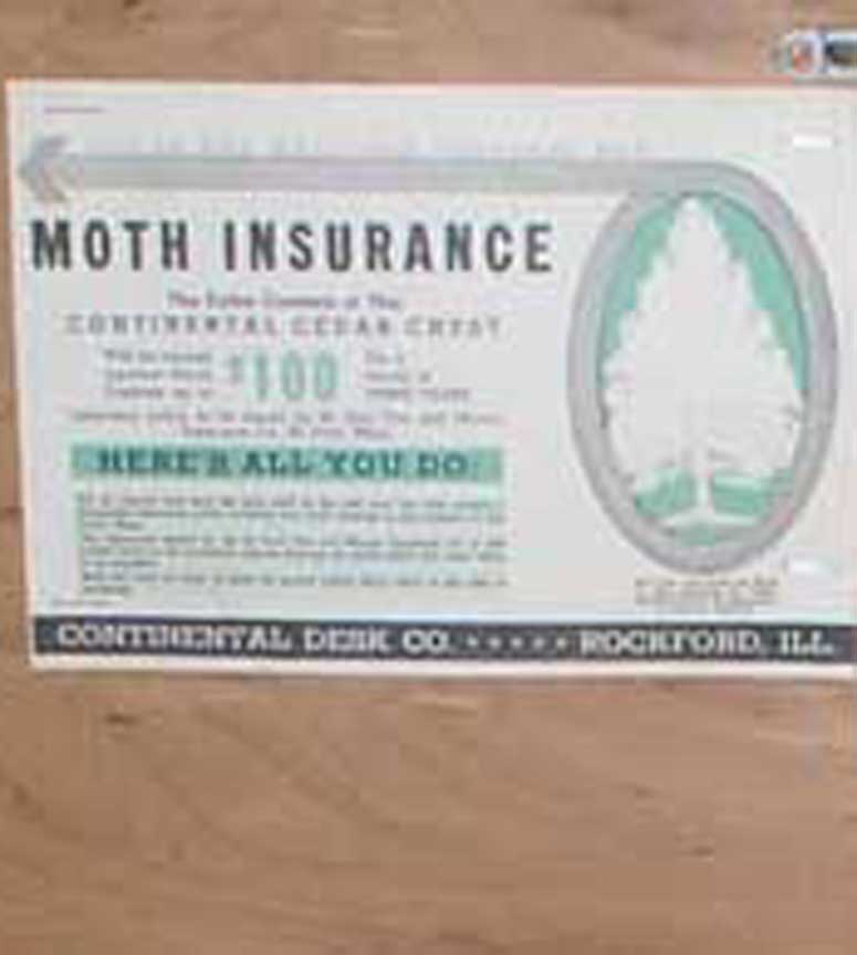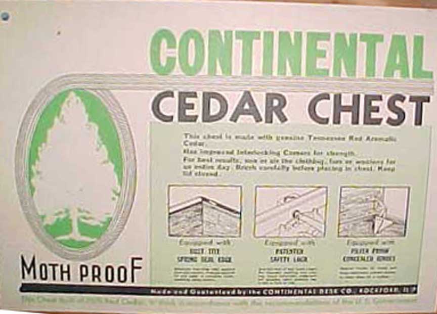 Rusty's Continental Cedar Chest Click to Enlarge Ms. Michelle, from Minnesota found a Queen Anne style cedar chest, also made by the Continental Desk Company. In addition to the label shown above, this one includes the application for the Moth Insurance Policy.