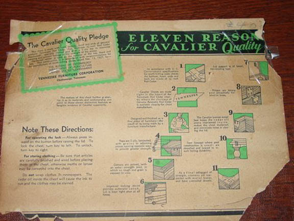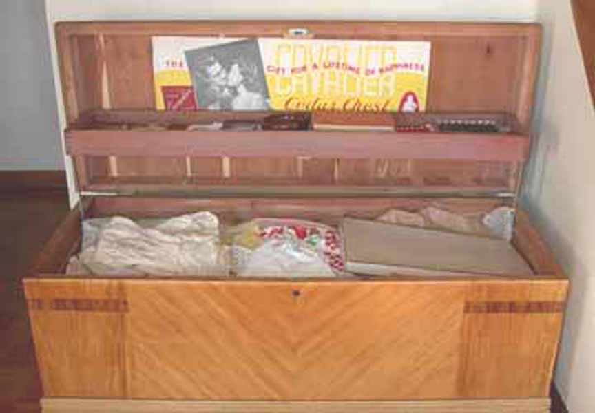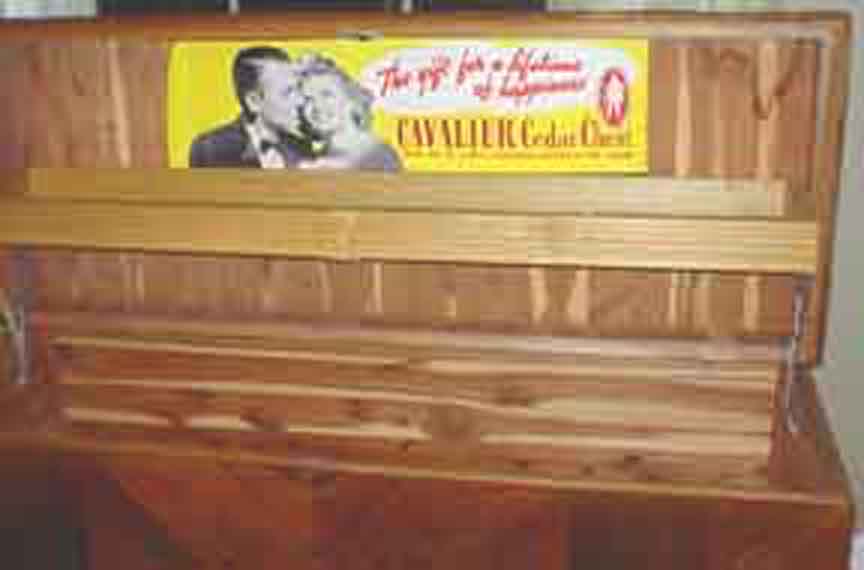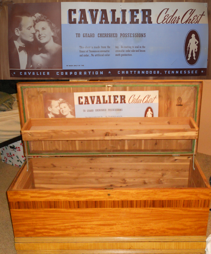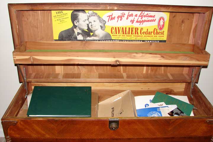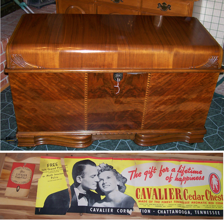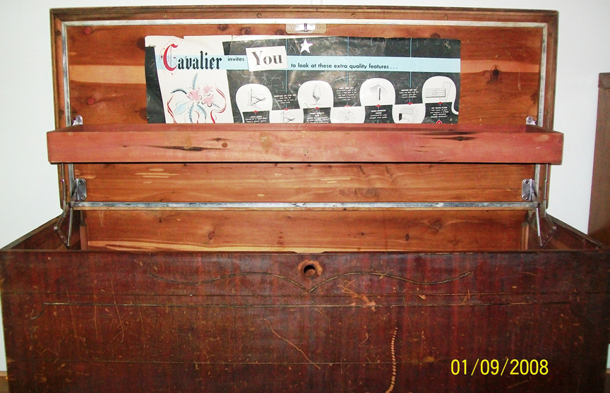 Katie's late 1940s Cavalier Cedar Chest Click to Enlarge Here are photos of a 1940s chest sent to us by our friend Deb, in Illinois She writes: "... My Aunt passed away on Feb. 1st at 84 years of age. While cleaning out her house, I found this chest. It was complete with all of her gathered utensils, tablecloths, towels, sheets, bowls, cups, etc. Under all of these treasures, hidden in a brown paper bag, were love letters written to and from a man that once had propsed to her..."