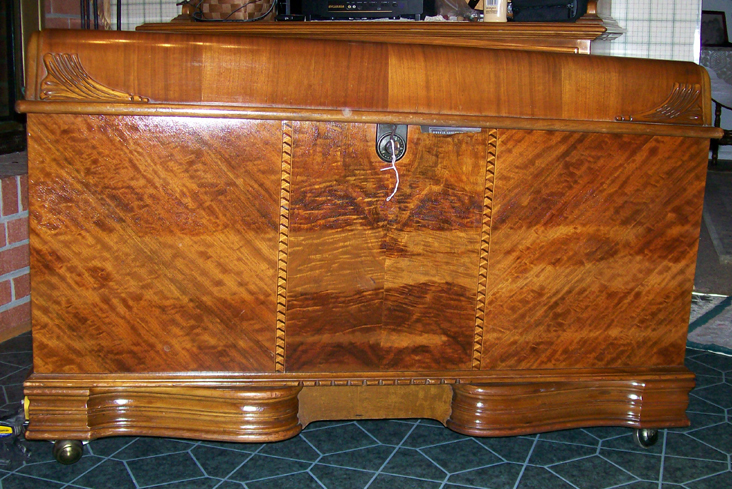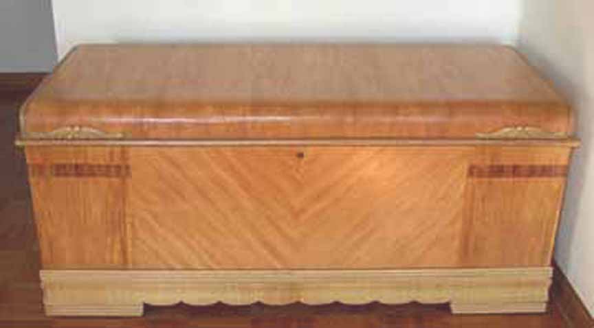 Waterfall Cavalier Cedar Chest Made in the 1950s Click to Enlarge Here are some 2005 photos from a family who found a Model 123 in very poor condition and then gave it a loving restoration. Thanks, guys!