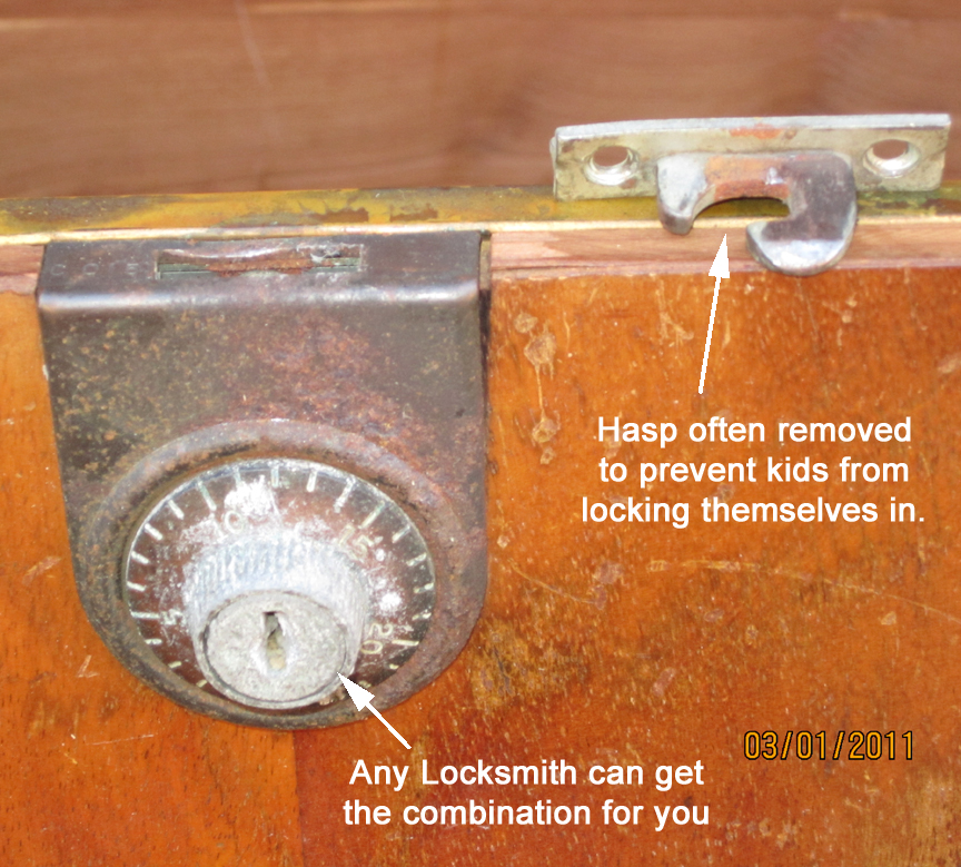 Scotty's Cavalier Hall Chest Clockwise from top left: Closed, Open, Internal ad, details of combination lock Click to enlarge Chris from Indiana sent us these photos of a very unusual chest that he found in Delaware. It has an electric clock built into the lid! This chest is in very good shape and has all the labels. This was a nice find. By the way, it looks like the cord needs to be replaced on that clock!