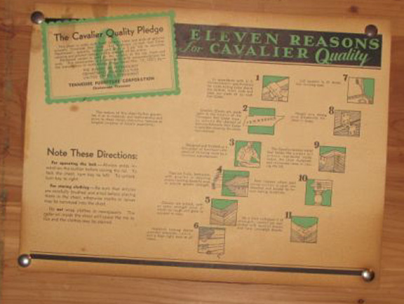 Janelle's 1930s Cavalier Cedar Chest Chest .. from a very nice Mother-In-Law Click to Enlarge It This is definitely a traditional cedar chest from the 1930s (or early 1940s) as evidenced by the typography on the paper insert and the metal Cavalier badge. Janell wwas very fortunate! Here are some photos of the "jazziest" waterfall Cavalier Cedar Chest that we have ever seen. They were sent in May, 2011 by our reader Faith who has this to say: "... My boyfriend and I recently purchased this cedar chest at an estate sale. I have searched on-line for similar models without any success. I know it is a "Waterfall" style, however, this one has a drawer in the bottom and the top has built in clock, two glove boxes?, and two change/key holders?. This is an unusual style and I would like to share so more people who may have one may choose to share their pictures and information they may have on-line. Thank you for your time andhave a great day ..."
