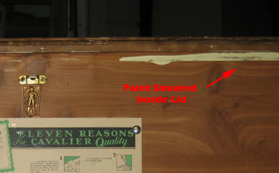Deborah's Recently Acquired Cavalier Chest Click to Enlarge These pictures were sent in by our readr Kim. She writes: "... just wanted to send a few pics of my cedar chest. It was my great grandmothers and I still have the sales tag from the store. Not sure what year it is..." Our best guess is that this is from the late 1940s to the early 1950s, judging mainly by its rectilinear shape. We also note that the Amalgamation Technique described in our companion page could do wonders for this chest with only a small amount of work.