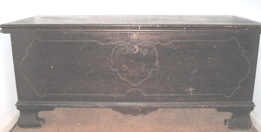 Continental Cedar Chest Queen Anne Style Insure your clothes against moths... Click to Enlarge Our reader Kathi from Kansas sent us some pictures of a chest with a Cavlier tag that has us stumped -- the chest has been restored, but evidently looked like this originally. Kathi writes: ".... This Cedar chest belonged to my grandparents who were married in 1916 in St. Louis, MO. It has the metal Cavalier Furniture Tag, but it seems different from any of the others in your web site as it is painted on cedar. When we got it, the finish was a very dark black and crackled, but as we removed the old varnish, we found the black painted design which wasn’t visible before. Do you have any idea what style this is? Each of the black areas is outlined by a thin carved line. In one of the corners on the top, the carver goofed and re-did the carving, and you can still see the original carved line, so I am sure it was all hand carved and painted. Thanks for putting this on the website, maybe someone will recognize it. I really don’t know if someone did the detailing work of incising the wood and painting it after it was bought, but the way it fits with the detailing, raised wood areas, etc. makes me think it came that way from the factory ..."