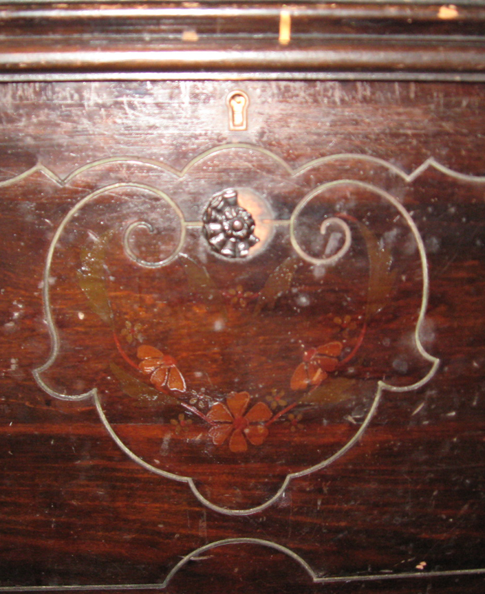 Nicole's Traditional Cavalier Chest Click to Enlarge It Actually, we're pretty sure that the chest was made much earlier, based on the incised carving. The woodburned mark is quite different from the woodburned mark of the 1950s. This is very nice, but it does need some "refreshing" In late January of 2010, our reader Jill from Boston sent us some "before and after" photos of a Jacobean chest that she restored. Here is what she wrote: "... Thank you for the help you gave on your website as to how to restore Cavalier cedar chests, I wanted to send you these 'before' and 'after' photos of my cedar chest (could be as old as 1924?), since it is finally finished. It originally belonged to my mother’s Aunt Dot (1908-2001, my grandmother’s younger sister), a gift from her boyfriend. In order to pay off a debt, Aunt Dot gave it to my grandmother Margaret (1903-84), who had it in her house when my mother Marilyn was growing up, my mom used it to store sweaters in. Margaret gave it to my mother around 1963 when Margaret moved to Florida around the time of my parents’ marriage. My mother kept it in her basement for years. When she gave it to me a few years ago, it was not in good shape because it had also been moved a few times, etc.. An antiques restoration professional told me that it would probably not be worth it to pay him to restore the cedar chest because of the shape it was in. I finally found a co-worker who was willing to do the restoration work for a fair price. He has a lot of patience and skill and did a wonderful job, taking pride in his work. Actually, I had asked this co-worker for advice before I talked to the professional, at the time he said that he was not the right person to do the job because he did not want to ruin a valuable antique. I paid an artist I know to reproduce the flower design artwork. Thank you again for keeping the Cavalier cedar chest website going, ..."