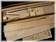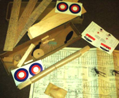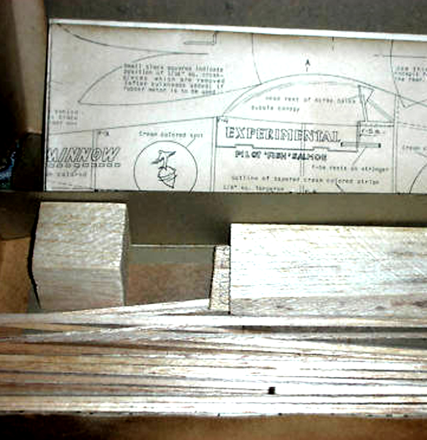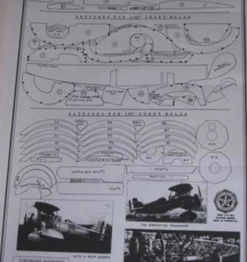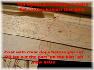 The Cleveland Company drew fantastic plans but economized on the balsa -- this photo shows some of the Formers printed on the sheet where the grain of the wood made them ultra-hard to cut out ANF prone to splitting. My trick is to coat the balsa with clear dope on both sides. Then cut to about 1/16" of the line and sand the rest of the way with an emery board. I get the best fit if just the faintest trace of the line is showing on the cut-out part. All symmetric (or identical, like wing ribs) should be stacked on top of each other for a final sanding to assure that they match perfectly. I made a special gadget to cut the notches for the stringers so that they would exactly accept a 1/16" or 1/8 balsa strip.