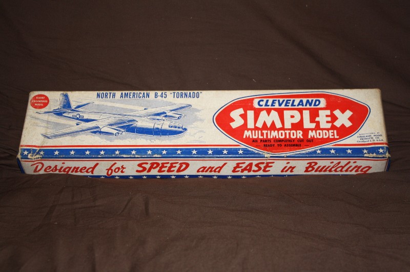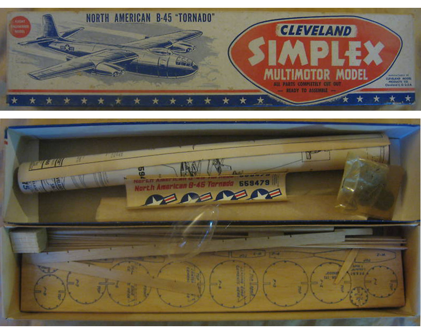 As far as model making is concerned, the general notion of a tissue-covered balsa frame does not serve modern jet-powered airplanes very well. In general, the best subjects for balsa modeling are those where the actual construction mirrors the balsa construction. The particular kit shown below is from the Simplex series that Cleveland brought out in the mid-1950s. The Cleveland company thought that declining sales were due to the reluctance of Boys to cut the parts out of balsa. This series featured pre-cut parts that were assembled by the modeler. From my own perspective, balsa modeling did not seem appropriate for jet aircraft. However, as America's first jet bomber, the B-45 is certainly a worthy subject for modeling.