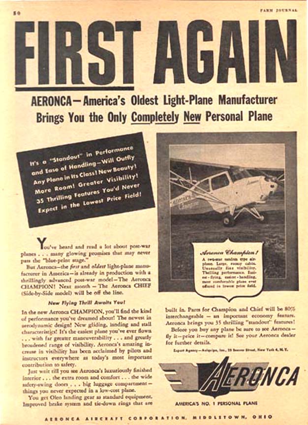 The Aeronca Sedan is a four-seat light airplane which was produced in the United States between 1948 and 1951. As such, it is comparable to the Beechcraft Bonanza and the North American Navion> The Sedan was designed primarily for personal use, but it also found applications in utility roles including bush flying, since Aeronca certified a seaplane version.