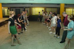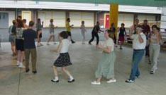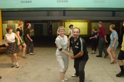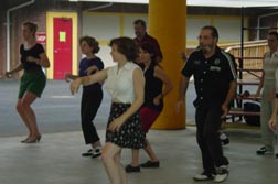 For two nights Ellen and Marc gave us a little more insight into the mysteries of dancing after 1950. Specifically they focused on three group dances of the period: The Stroll, the Hand Jive, and the Madison. By the way, they will be repeating this class -- check their website for details The word stroll can be used to refer to any repeating formation line dance. If you search YouTube, you'll find lots of modern "strolls". However, if yo have come to this website, you are probably looking for "The Stroll", the classic line dance of the 1950's. It is performed to slow swing and rhythm and blues The stroll is popular throughout the swing scene in Europe (strange as it's an American dance). Less danced in the US, it's addictive so that this will soon change, especially if Ellen and Marc have anything to do with it.... However, "The Stroll" of the 1950s should not be confused with another Lindy-Related group dance called The Jitterbug Stroll, as discussed below. Music You can do "The Stroll" to loads of swing music. Popular choices include - On Revival Day (Lavern Baker), Lavender Coffin (Lionel Hampton) and My Baby Just Cares For Me (Nina Simone), or"C.C. Ryder" (Chuck Willis). Strolling was popular on American Bandstand and is also part of the film American Graffiti (George Lucas), done to the eponymous song The Stroll created by The Diamonds after the craze began. Origins The emergence of "The Stroll" as a recognizable dance is due in large part to American Bandstand, a popular televised dance party that began in 1954. Initially, the show's regulars created the popular dance called the Bunny Hop. Following this success, the kids began churning out new dances for every new beat, including The Stroll, a slow, simple dance, where two lines - boys on one side, girls on the other - faced each other, shifting from left to right, then back again. The fun came when the couple met in the middle to strut down the aisle, all eyes on them. The dance was inspired by Chuck Willis' hit C.C. Rider. It became so popular that Willis was dubbed "King of the Stroll." But the dance soon got a song of its own when Dick Clark suggested to the Diamonds that they create a song specifically for the dance. The Diamonds were already hot with their hit Lil Darlin' (1957), struck gold again with The Stroll --- famous for its opening line,"Come, let's Stroll.". For us Lindy Hoppers, Chuck Willis vs. the Diamonds is sort of reminiscent of the debate about The Jitterbug Stroll (one of our group dances) --- should it be done to Woodchopper's Ball or the called version by Steven Mitchell? The Steps The stroll is done in two parallell lines (leads on one side, follows across the divide.) A simple basic step-pattern is performed in such a fashion that the line advances, or moves one pace with each pattern. Individuals on each end pair up and perform a "shine" routine as they proceed down the line; at the end, they separate and rejoin the lines. This formulation is part of many "contra" dances that were done in the US and Europe for centures. Thus, in one sense, the Stroll has been with us for a long time. Here is our best verbal attempt to capture the essence of the "stroll step" -- it will help you decipher the video link given below. If you can improve on this, or if you have an instructional video, please Contact Us and we'll be glad to put it on the site! Stand, feet about 24" apart. (this is "open")