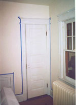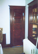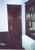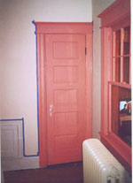 Uploaded 6-15-2001 When I started this project last November, I had no idea about how long it would take. Yes, I have been working on it for about six months... The scope of the work was somewhat extensive --- I had not touched my office, library or hall in 20 years. The goal was to return these three spaces to more-or-less 1922 (that’s when the house was built) conditions with unpainted woodwork. It would be possible to strip the paint off, but this is a very messy job and there is always the problem with Lead Based Paint . A mess is one thing, but living with a mess AND wearing a respirator at the same time is another thing. I remembered that my Dad’s woodworking business included two German men who could make anything out of anything and if need be, make anything look like anything else. One summer, I was involved with these fellows in a project to create a whole room in red mahogany --- even though the budget only allowed for pine. I remember how wonderful the results looked. A lot of this was done from memory, although I had some very good assistance from the guys at Monarch paints. Basically, there are four "steps" --- given that you have a room that has all the plaster in good shape and there is a good coat of paint on the walls. If you are restoring a house, you can plan on painting everything in your room five to six times. My project involved 13 double hung windows (and shutters), 8 doors, a large built-in bookcase, and a stairwell. Step 1: The woodwork must be painted with a very high quality shecllac-based primer to ensure that the graining stays bonded to the wood. The existing painted surface should be roughed up (and cleaned) with synthetic steel wool. Remove all sanding residue and prime, allowing plenty of time for the primer to dry. Step 2: Apply the color base. Red mahogany has a "pink" undertone. I experimented for some time, mixing pigments with white paint. When I got the pink that I wanted, I took the sample to the Monarch paint store and they mixed me a gallon. This is flat interior alkyd paint. Alas, no latex paint here. Prepare to wear rubber gloves and buy a lot of paint thinner. The color base needs to dry hard, allow 3 days. Step 3: Apply the graining medium. The "medium" is pigments (brown, red, burnt umber) in spar varnish. The pigments will not blend uniformly, and when spread with a brush, or tool they will form what appears to be the grain of wood. I had some trouble getting this part right when I got a great hint from the guys at Monarch. I bough a gallon of Minwax Red Mahogany stain, let it sit for a week, and poured off the solvent liquid. What was left was the correct mix of pigments. This was mixed on a 1-1 basis with Spar Varnish to create the graining medium. The project actually used a gallon of the stuff! The doors are done in the following order: panels, rails (horizontal) and stiles (vertical). The panels are grained to simulate hearts of mahogany. The graining medium is applied, allowed to dry for about an hour, and then worked with a variety of tools to create the desired effects: