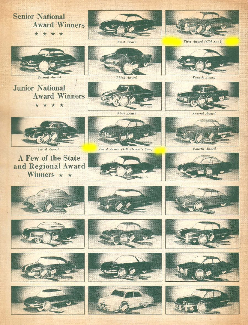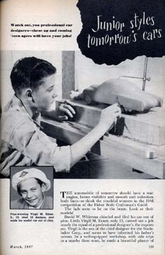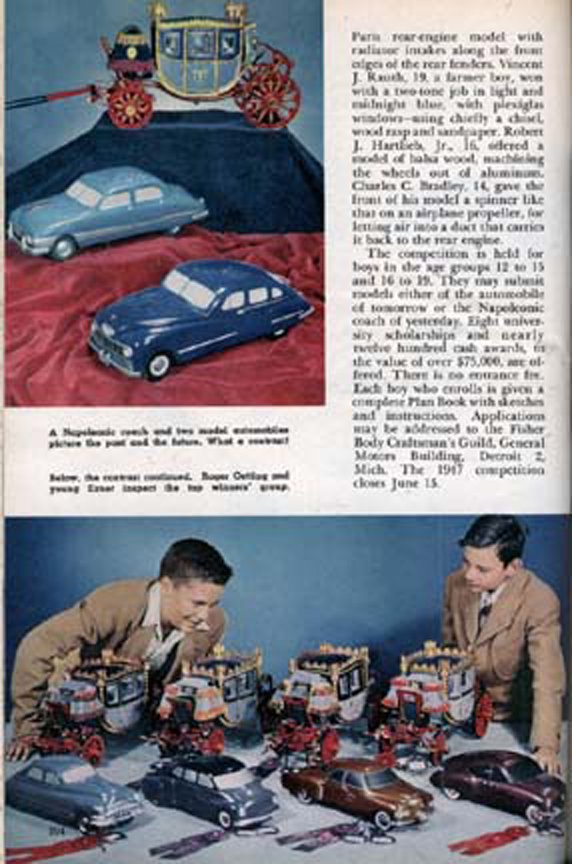 Ed Roth's Mysterion Car and Jeff's Reproduction Headlight Mold Click to Enlarge Your readers should get a copy of John Jacobus' book on the Fisher Body Craftsman Guild -- it's very informative. Also he is working on a possible sequel consisting of bios from couple dozen Guild alumni telling their Guild memories. I am honored at being considered for inclusion in his book as an also-ran story! I helped John get an article published in woodcarving magazine. ..." Here are the articles -- and they are very well written: Did Nepotism Raise its Ugly Head? As I looked through the materials on the Car Contest, I found this 1947 article from Mechanix Illustrated that shows winners from both the Coach and the Car Divisions: