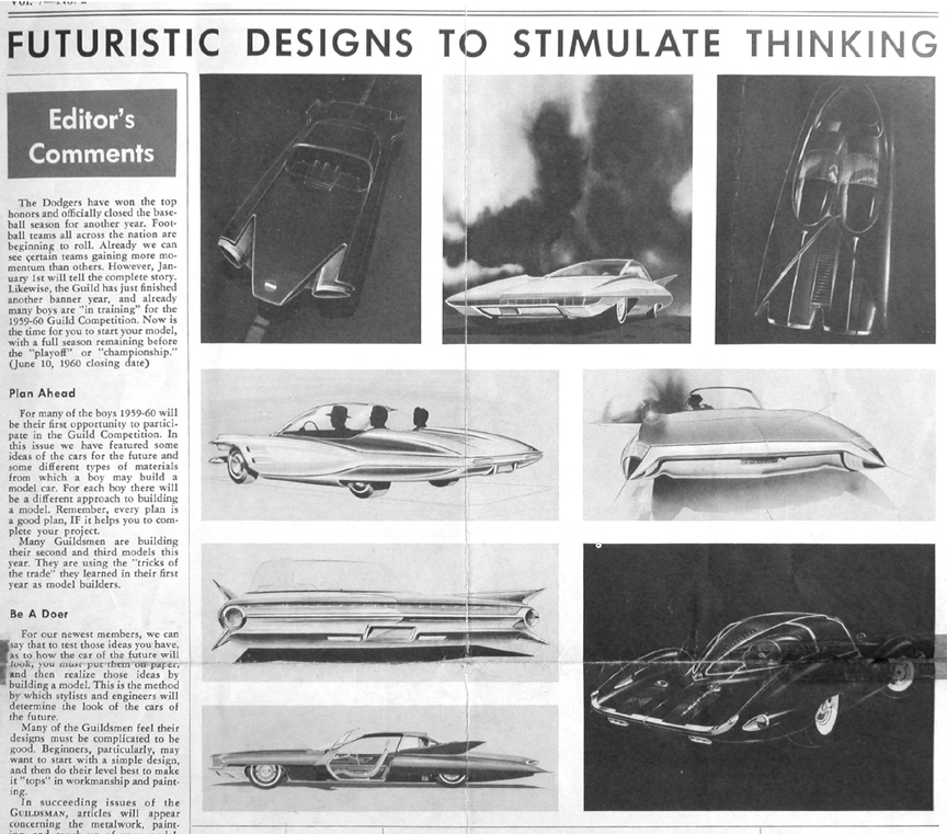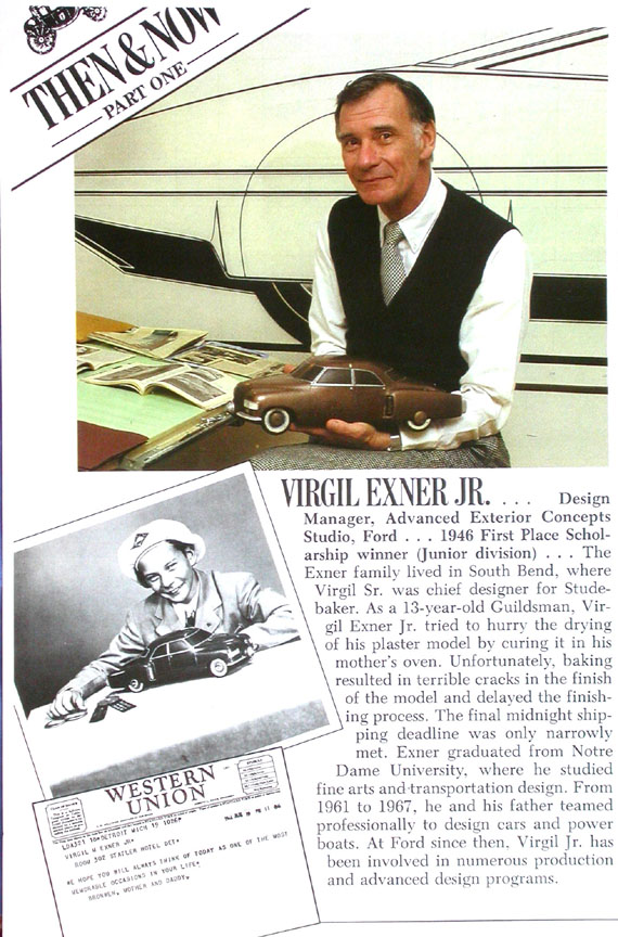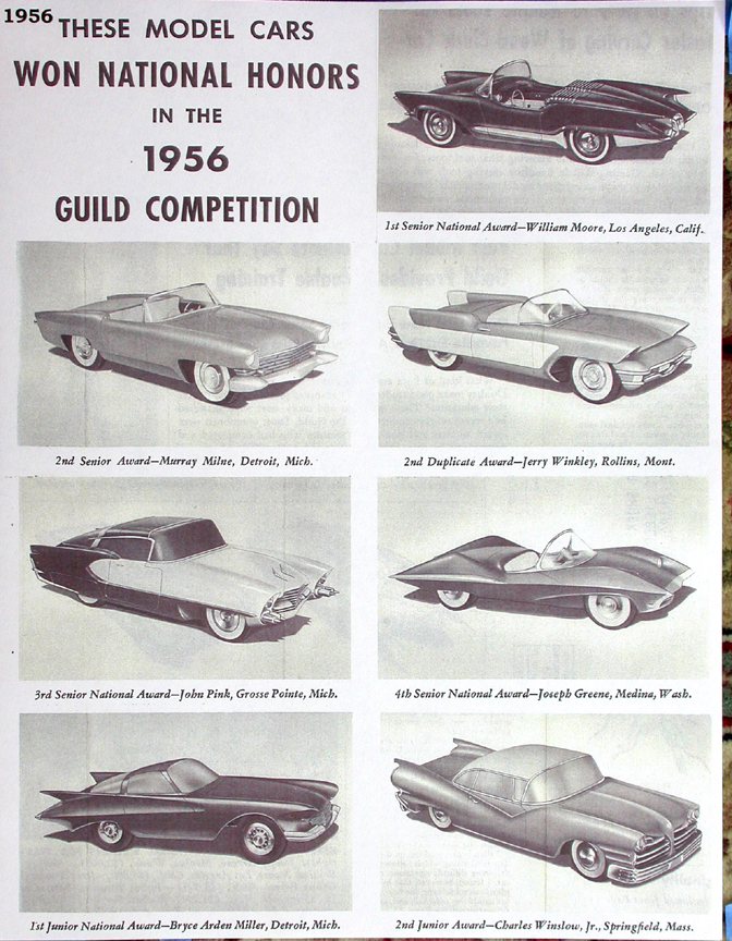 Click to Enlarge The principal reason that I have reproduced this article is that it features a very young Virgil Exner Jr., wearing his Guild Beret. Mr. Exner, Jr. was the son of Virgil Exner, Sr. who was to rise to head the Chrysler Design Division and gave us the "Forward Look" --- all those giant cars with big tailfins. Some of the most extreme are: The 1957 De Soto De Soto sponsored Groucho Marx's TV program, but soon faded from the scene. The 1956 Chrysler Imperial I love those tail lights sitting up there - America's answer to Sputnik. The 1960 Crown Imperial Convertible I think that this got 4 MPG, but it could sure haul butt.... The 1960 Dodge Royal Lancer This was a real monster for a "working class"car Click to Enlarge I was a little bit worried about the appropriateness of Exner, Junior entering the contest -- he had a rather large advantage over a kid from rural Wyoming. I asked Guildsman Jeff about the possibility of Nepotism. He wrote back: "... it isn't too unfair that Virgil Jr. won a top prize. First, the judging was 100% anonymous (my cars came back w/ 5-digit serial numbers hand written on the bottom in black sharpie. I imagine they had a [lower level employee] unpacking and labeling the cars before the big buys ever saw them. Second, the contest rules stated that if a relative of a GM employee ever won an award, they awarded a duplicate to the next best car so there was never an unfair advantage. That happened several times over the years. (Actually, if I were a judge an I knew the son of a competing car company legend was entering MY contest I might be biased in the other direction. But that's just me!!) ... building a car to the standards of the Guild was REALLY TOUGH and no matter how a guy did it, odds were stacked really high against him winning anything. ..."