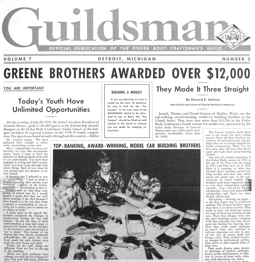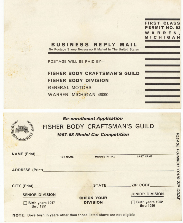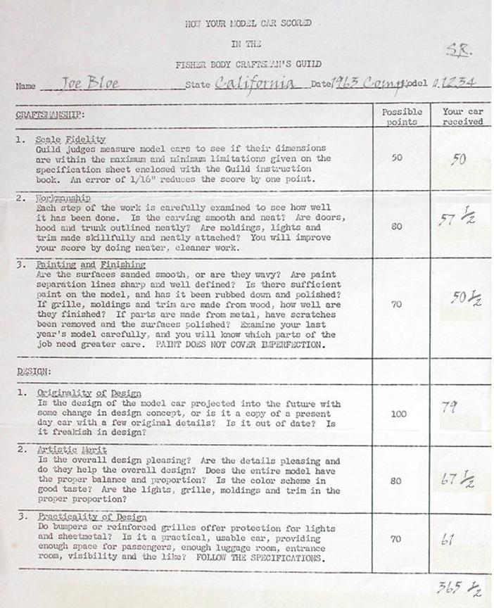 Sample Scoring Sheet for the Fisher Body Craftsmans Guild Car Contest Also: Yearly Re-enrollment card for the Guild you got a package of a "Designing and Building a Model Car", the first issue of the Guildsman newspaper, and 4 rubber wheels.Click to Enlarge Several observations: