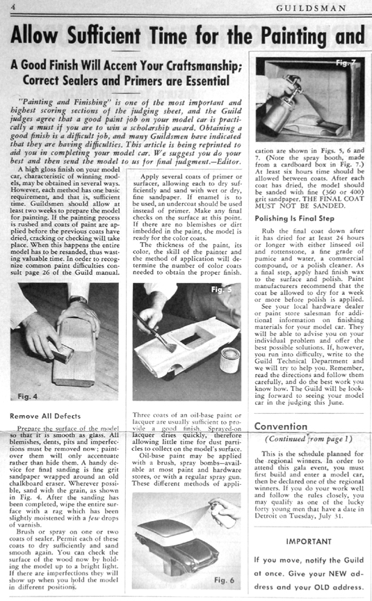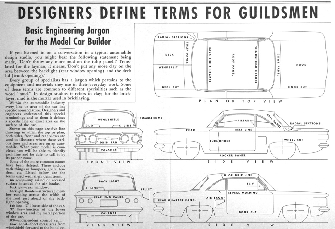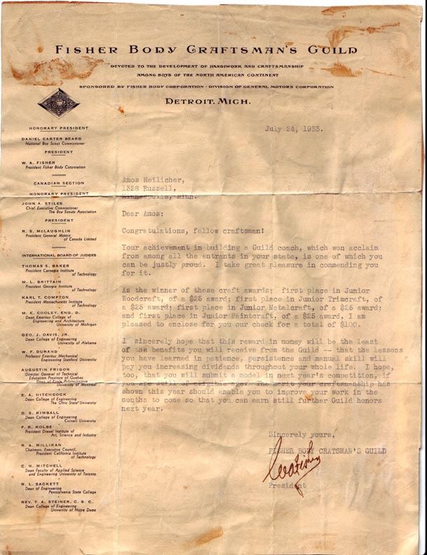 Signing Up for the Fisher Body Craftsmans Guild The sign reads: "...an opportunity to earn your college education as well as 980 other awards..." Taken in the Fisher Building, Detroit Daniel Carter Beard, head of the Boy Scouts was the FBG Honorary President Click to Enlarge Here is an article about the Fisher Body Craftsmans Guild that I found in the TIME Magazine for August 31, 1931 TIME Magazine, August 31, 1931 That's Nelson Rockefeller's Uncle on the Cover Click to Enlarge Oldtimers insist that there are still carriages on the streets of Norwalk, Ohio, built by Andrew Fisher. Andrew begat Lawrence, also a wheelwright, and Lawrence begat seven sons. They were named William Andrew, Frederic John, Alfred Joseph, Charles Thomas, Edward Francis, Lawrence Peter, Howard. William Andrew was the lazy one. He would cock his hat over his eye, pretend not to see his father beckoning him into the blacksmith shop. But ultimately he and all the rest except Howard industriously followed their father's and grandfather's trade. After the turn of the century the six Brothers Fisher started Fisher Body Corp. William Andrew became president. General Motors took them in and today they are the most numerous, most affluent guild-family in the world. Partly to advertise Fisher Bodies, and partly because they relish good craftsmanship, last week they had a party. To the Fisher party, held in the auditorium of the GM building in Detroit, went 104 boys from 48 States and the District of Columbia. They were all either junior (12 to 16) or senior (16 to 19) members of the Fisher Body Craftsman's Guild. Each had constructed a model of the Napoleonic coach which is the Fisher Body trademark. Some 1,350 other U.S. boys had built models too, but these 104 were the best. In the pocket of his Sunday suit, each boy had some part of $50 which General Motors had given him for spending money during his visit to Detroit. While Graham McNamee gushed a description of the setting over a national hookup on the General Motors Family Party radio hour, each boy wondered if he was going to be one of the four to receive a $5,000 four-year scholarship at college. Formed last August, the Guild had sent its members specifications for the coach. Technicians had examined hundreds of models, alike to the lay observer as two peas in a pod. The judges included President Thomas Stockham Baker of Carnegie Institute of Technology; Board Chairman Robert Andrews Millikan of California Institute of Technology; Board Chairman Samuel Wesley Stratton of Massachusetts Institute of Technology; Dean Dexter Simpson Kimball of Cornell's College of Engineering and eight other engineering deans and professors. Also there was Daniel Carter Beard, national Boy Scout commissioner, who served as honorary president of the Guild, of which William Andrew Fisher is president. President Fisher, who wanted to see what the nation's boys could do with plane, chisel, glue and mould, had sounded the Guild's keynote last year: "It is our endeavor to foster . . . that spirit of fine workmanship which permeated the craft guilds of bygone centuries. . . . There was a pride in workmanship which kept alive a competitive spirit among Guild workers, and there was a healthy rivalry between Guilds in the same industry. . . . Regardless of the advancement in machinery, there is today and will continue to be a need for real artisans and craftsmen." Hushed was the hall when the ice cream plates were cleared away. Impressively the winners were announced. One of the senior Guildsmen had won on his home ground-Raymond S. Doerr of Battle Creek, Mich. Graduated from high school in February, he was encouraged by his father-a pattern maker for a plumbing manufacturer-to build a coach instead of looking for work. He set up a workshop in the family's basement. The other senior winner was a boy named Albert Fischer from Waukegan Ill. He was let out of his draftsman's job, spent 1,200 hours on his coach. Howard Jennings, one of the junior scholarship winners, came from Denver, Colo., used the machinery at the printing shop where his father is a steel engraver. Donald Burnham of West Lafayette, Ind., worked at home in a little basement. An old hand at modelling, he once got a trip to Europe for making a miniature airplane. When they have finished their college courses all the winners will be offered General Motors jobs. The Car Design Contest In 1937, the competition allowed entrants to choose between making a coach OR making a model car. Building the Napoleonic Coach attracted a crowd of technicians who were really good at following plans. Fisher would have wanted lots of these guys as craftsmen. BUT, the essence of the GM business plan was selling styling. I'm not sure whether the Coach brought out men of Vision -- I think that the Car contest was instituted to find forward thinkers. It was probably good to require that the Car designer actually make the model -- this would weed out a lot of fantastic confections that could never be manufactured. Over the years, the available materials have changed, permitting a variety of shapes to be made. I understand that 1920s cars look like they do because of materials availability, road clearances needed, and frame design. Similarly, I am told that streamlining was limited during the 1930s and 1940s because steel could only be pressed to a certain radius of curvature, etc, etc. I also assume that the investment in dies, tools and training favored a styling that made only small modifications, with emphasis on the easy part like sheet metal. Here is a link to the Manual that would teach you how to make and submit your model car. Car Styling Terminology Throw Some Mud on that Tulip Panel... Actually, cover that Corvair with mud... Click to Enlarge Thanks to Guildsman Jeff, here is a sampling of the contest rules and model-making advice that were provided to competitors in the Car Contest.