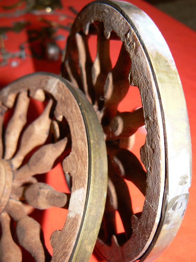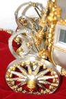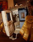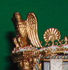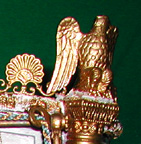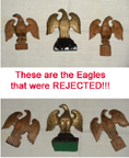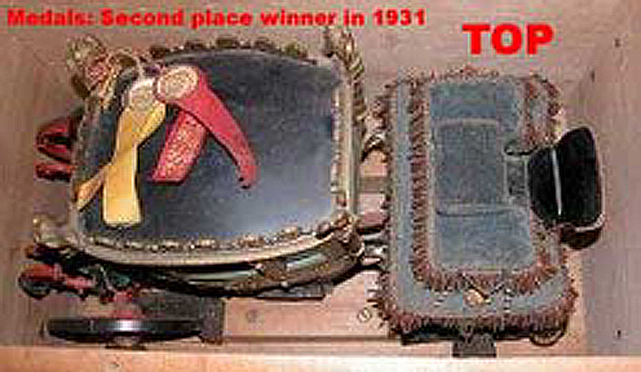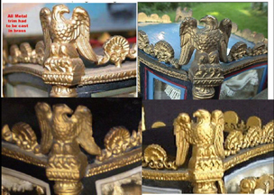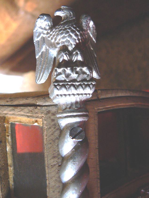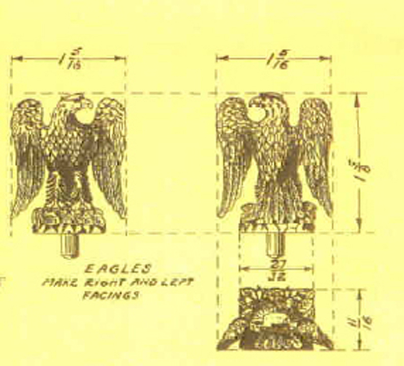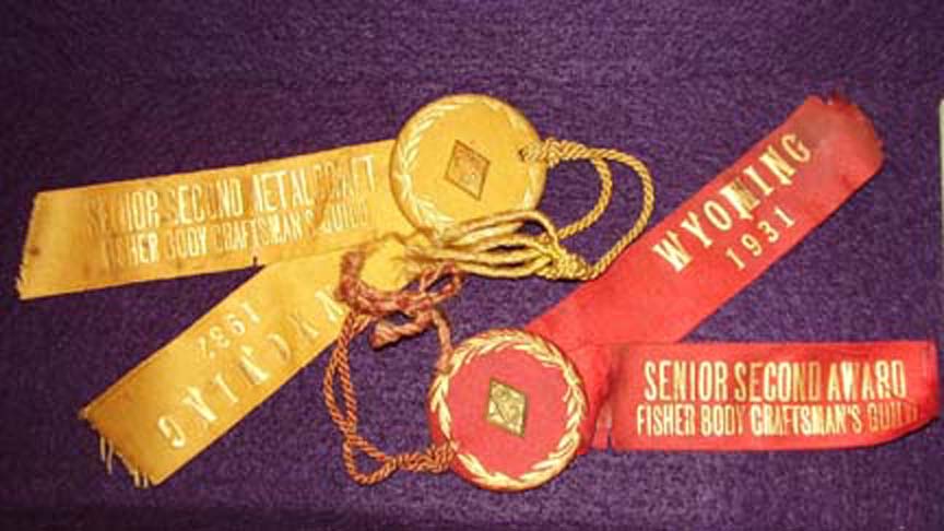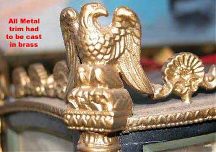 The Medals Yellow: Senior Second Metal Craft, Wyoming, 1932 Red: Senior Second Award, Wyoming 1931 Click to Enlarge Since the coach won a price for metalwork, it might be reasonable to assume that the trim, including the eagles, was made from scratch. Jeff says that this is not necessarily so: "... If you study your coach, you will see a ton of work had to be done even to get the supplied parts into presentable condition. As you can see in the pictures in the collage, if the craftsman didn't do a lot of filing and touch-up the result was pretty crude. The supplied casting were for the eagles, filigree around the top, coachman standards on the back step, "F" shield on the doors, wheel hub covers, wheel decorations and chassis keel. There were still a lot of parts that had to be hand crafted like the fold-out foot step under the doors, door latches, the twisted wire trim, all the metal fittings on the trucks, etc. I can see giving an award for exceptional work on all that stuff....