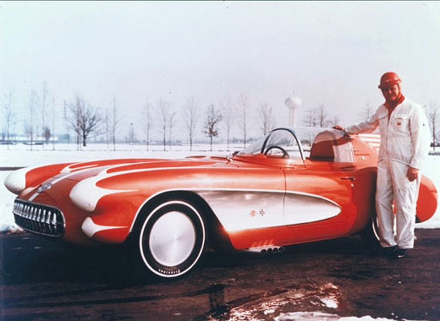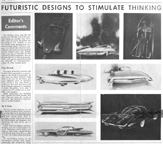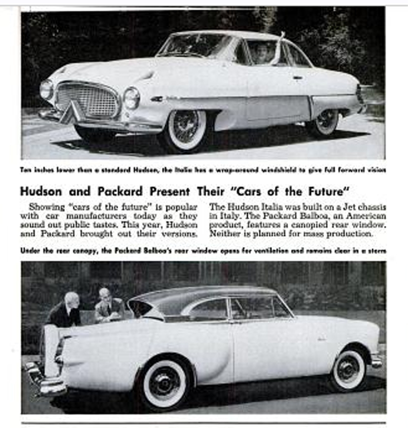 Harley Earl's Le Sabre and Corvette SR2 Click to Enlarge On the other hand, these photos, taken from a November, 1953 issue of Popular Mechanics indicate that the executives at Hudson and Packard were no better than the kids at dreaming up the future. Both companies folded in 1954... The Execs Had Less Vision than the Kids 1953 Hudson and Packard "Dream cars" Click to Enlarge I assume that GM's selection involved all the practical limitations on car design that a realistic designer should consider. So, I asked real live Guildsman Jeff about his thoughts on how much "vision" and how much "pracitcality" went into the winner of the Guild car competition. Other questions were: What was your personal design process? What about hot rodders and customizers? How much of the Guild was influenced by those guys? Did George Barris ever enter the contest? Here's what Jeff had to say: "... Yes 99.999% of the Guild cars reflected the Detroit cars of the day, i.e., '58 Guild entries all looked pretty much like a '57 Chevy but there was always one or two cars that stepped it up a notch or two into the future. Here are some examples: