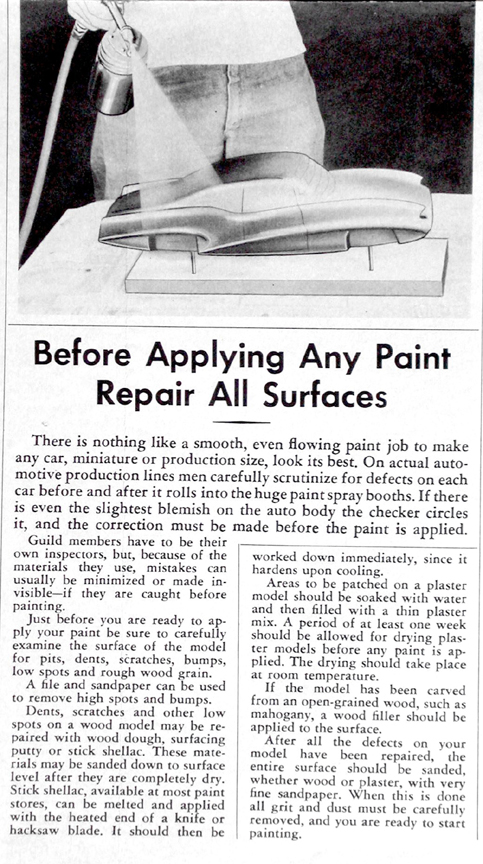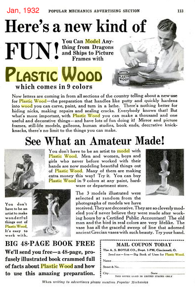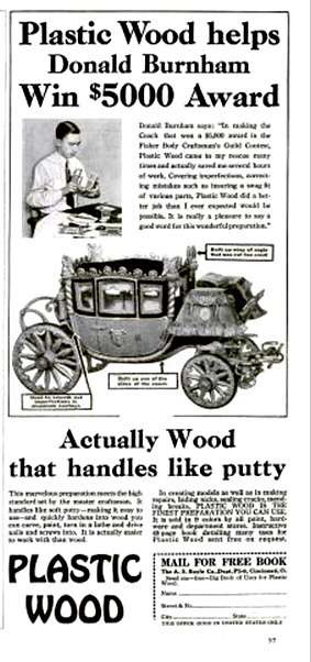 Plastic Wood and the Fisher Body Guild Competition Click to Enlarge We have compiled a number of ads that tout the usefulness of Plastic Wood in making models. (Click here to download a ".pdf" of these ads). Personally, I could not use this product in modeling because it is too difficult to work with -- maybe the formulation was different in the 1930s. Today it is mainly used to fill nail holes. During my research, I acquired a copy of the plans and scanned them. If you would like to match wits with the 14-year olds of 1931, contact me and I will be glad to send you a ".pdf"of the original plans. (it is about 5.1 MB, so it would help if you had a fast connection and a big mailbox!)