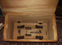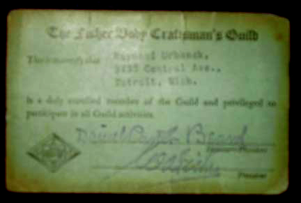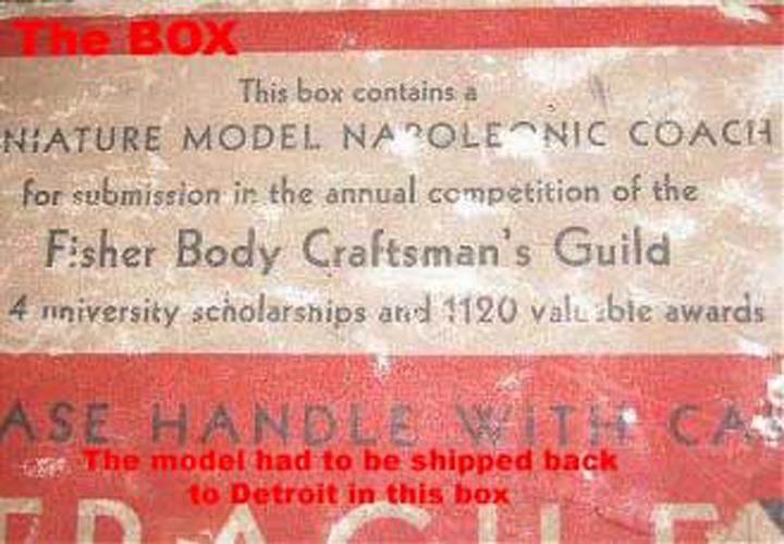Shipping label The Model Had to Survive the Trip to Detroit... Click to Enlarge Prior to opening this treasure, I did a little search to find out what might be in the box. Lo and behold, there is actually a Museum devoted to the Fisher Body Craftsmans Guild! This is the authoritative source, so check it out. The rest of this page is devoted to my own dabbling in the history of the Fisher Body Craftsmans Guild. With some anticipation, I carefully removed the screws to expose the contents. Indeed, they were marvelous!