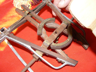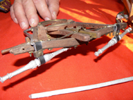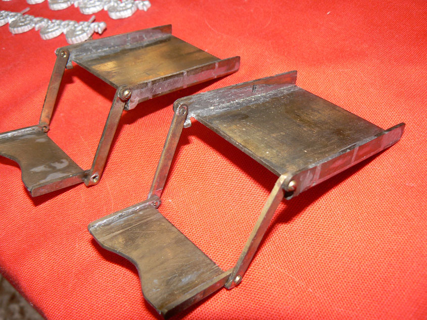 The Corner Eagles -- Example of metalwork Contestants were urged to fabricate these from scratch -- although a "Helper Kit" was available The Chassis The chassis and leaf springs had to be fabricated from stock! Click to Enlarge One of my readers, Jeff (an Actual Guildsman!!) had some comments about the degree to which the Guildsman who made my coach fabricated things from scratch. In the following photo, he compared the Corner Eagles on my coach with those on other coaches that are known to have used "stock" parts. Were the Corner Eagles Made from Scratch? My coach is in the upper left hand corner Click to Enlarge (You really need to do that...) Jeff Says: "... [after] studying that close-up picture [of your model] I am 99.99% sure those are the GM supplied parts. I study these things with a very critical eye (have a directory with hundreds of guild model detail photos 'just in case'!) and have NEVER seen a coach w/ home-made fittings. Yours have all the characteristics of the stock items including signs of the factory flashing and the 'soft' etching details which I believe would be quite different in a home made version. I attached a collage of your eagle with another left handed one and two right handed ones from my picture files. As you can see, the details are virtually identical and I submit that they must be, a) painted GM pot metal stock items, b) brass castings made from molds taken from the original pot metal, in which case yours should be measurably smaller, not larger, than the reference ones due to metal shrinkage associated with the casting process, or c) he had an example of the GM items and was a MASTER carver/engraver to be able to make a virtually exact copy. ...if you look at the GM working drawing of the eagle.., there is NO WAY you could duplicate the pot metal one so closely from that drawing. Take it from me, that is HARD to do even when you have the original sitting right there in front of you!! ..." My only rebuttal to Jeff was the fact that the coach that I found apparently won some medals. Here is a photo as they were found: