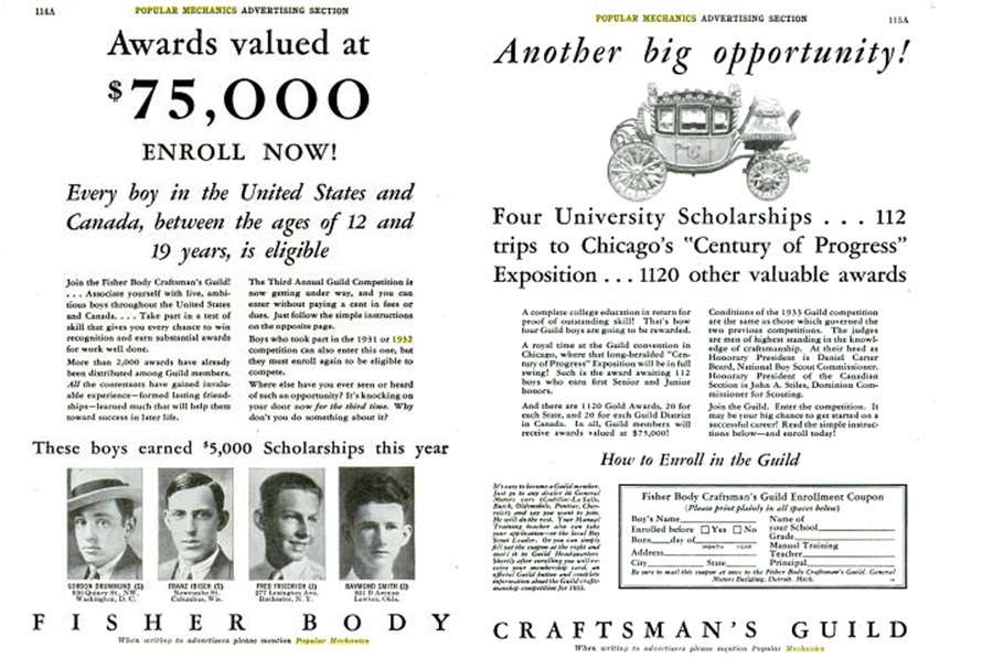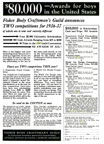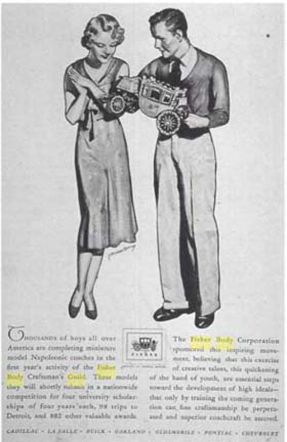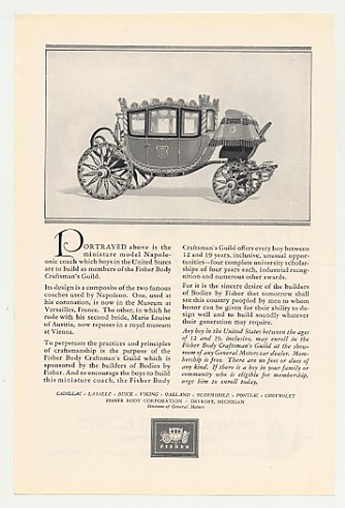 Ads for the Fisher Body Guild Competition Click to Enlarge The competition required the entrants to build a 1/12 scale model of Napoleon’s coronation coach (which also was Fisher Body's trademark.) The contestant received 19 pages of plans and nothing else. After spending about 2000 hours, the kids came up with something like the coach in the pictures. In theory, all of this - metal, wood, fabric and glass parts were all made by hand.
