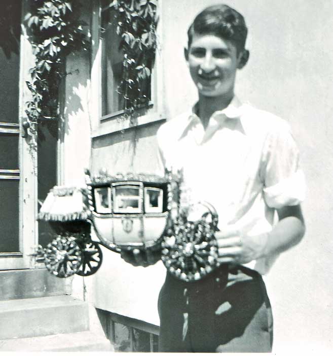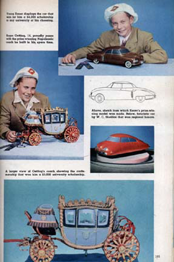 Nepotism and the Guild Yellow marks awards given to sons of GM Employees Exner fils turned out to be a designer after all Click to Enlarge I'll leave it to you: Did the Fisher Body Contest actually locate "stylists"? I was thrilled to get the following letter and photos from Marty, one of our readers in Los Angeles: My grandfather recently passed away and I was the very lucky person to inherit his Napoleonic Coach built back in 1933 when he was 16 years old. We have all the awards he won. Here is a photo that I took of the coach with my cellphone and a scanned snapshot of my Grandfather holding the coach at age 16 ![]() Marty's Grandfather with the Napoleonic Coach Click Photo to Enlarge It