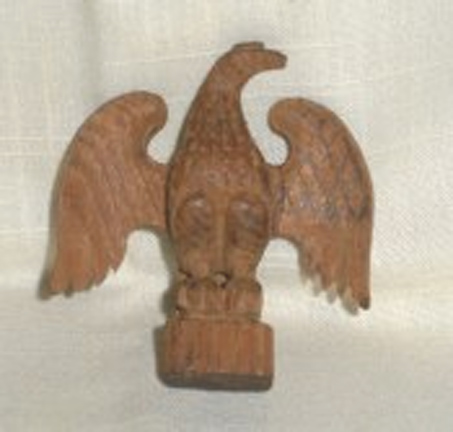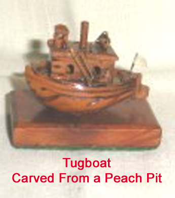 These are the eagles that were rejected! Click to Enlarge If that were not enough, Rick ends his note with this astounding piece of caring: "...Here is a photo (slightly blurred) of a boat (with a man on deck), carved from a peach pit. ..." Tugboat Carved From a Peach Pit Click to Enlarge I am sure that you will agree that this is an excellent Napoleonic Coach. It is just spectacular, although the coach has a "historically accurate" monogram for Napoleon ("N") on the door rather than the Fisher trademark "F". I don't think that distracts from the beauty of the coach or from its craftsmanship. (The judges at Fisher Body may have had another opinion...) On the other hand, we don't really authenticate these things -- I am just a guy who found an abandoned coach and got interested in the details. I suspect that this coach is "valuable" but I would not be able to put a dollar value on it. I am not a professional appraiser. That said, Rick's coach is very nice and deserves to be seen by the public. When he asked me about value, I said that the thing should be in a museum somewhere, and failing that, should be evaluated by a major auction house. (That would be my advice to anyone who writes in about values.) The debate about "scratch-built parts" was also joined by Skip who owns 28 coaches, and is in a position to know... He says: "... In my collection of 28 Fisher Body Craftsman's Guild models I have several that are 'scratch built' and no 'kit' parts were used. One of them is a 1932 FBCG national winner and the other is a 1934 FBCG national winner. Both coach models are not only completely scratch built but the trim work, especially the eagles, is far superior in craftsmanship than the hard parts supplied in the coach kits. The eagles on these two models are superb! "I have seen many other coach models that were also scratch built, and in most cases, the eagles and the trim pieces exceeded in detail the parts that were supplied in the coach kits. Among the items in my collection are two eagles that were cast by George Drummond, a 1932 national winner. These two eagles were spare eagles for his coach model. George hand carved a mold for his eagles (both left-hand and right-hand) and from that he poured a composition material into the molds to create a cast eagle. Both of these "cast" eagles are far superior, both in craftsmanship and in detail, to the cast pot metal eagles that were supplied in the coach kits. [My first photo] is a rear view of the 1932 national winning coach model built by Franz Ibisch showing the scratch built eagles and the "sea shells" on the roof...