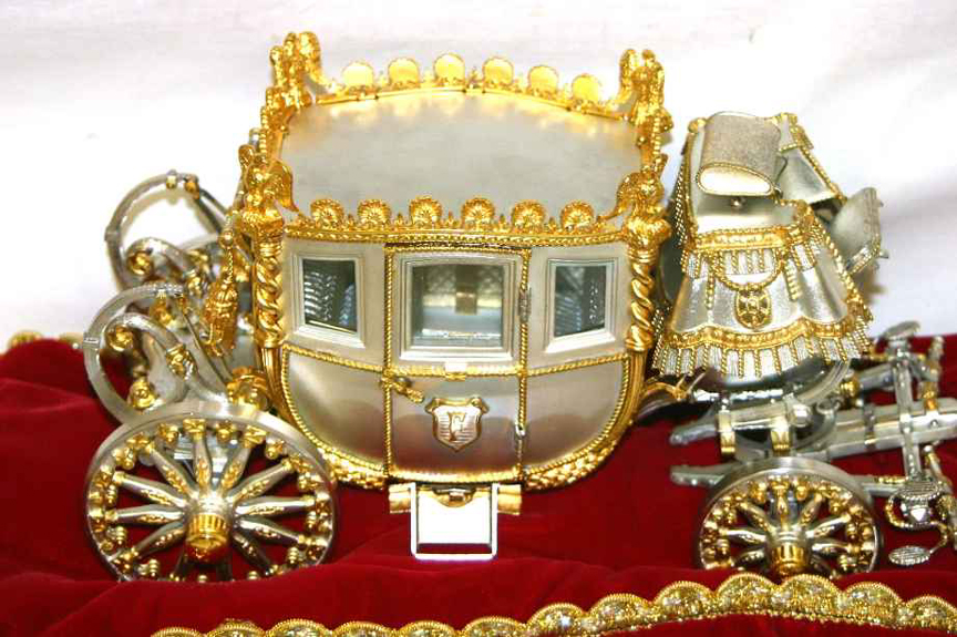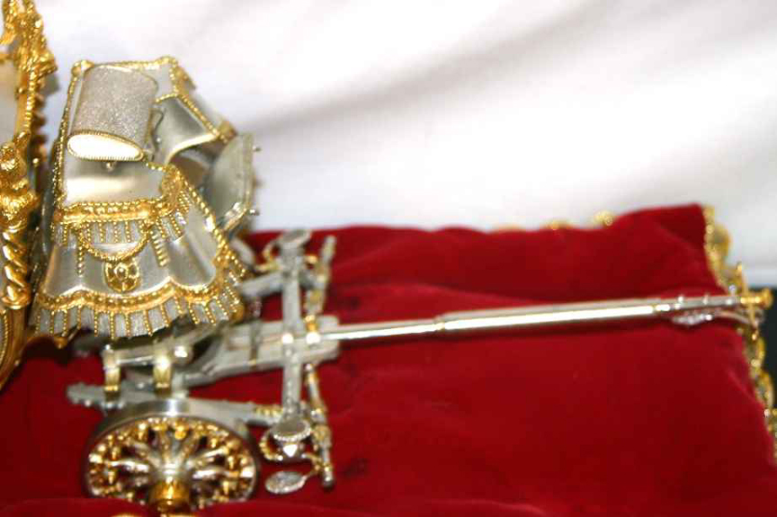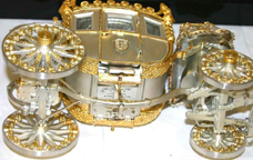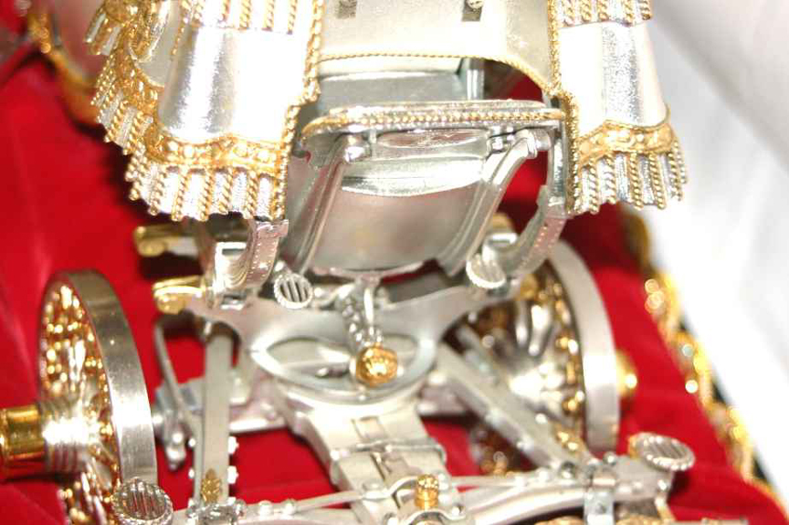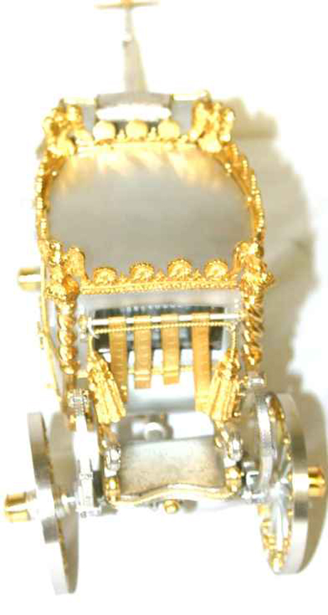 I envision the coach contest had a similar scoring sheet and your guy happened to score well in the standard "Metalcraft" category, not because of making exceptional hand-made parts but because his overall craftsmanship in presenting the metal parts was above average. ..." You might wonder: How would the pros already working at Fisher do in the contest? That question remained unaswered until 1973 when the company offered a Golden Anniversary Special model of the Napoleonic Coach doen in solid silver with gold-plated trim. About 1,000 of these were supposed to have been made, each inscribed with the owner's personal registration number (see plate on bottom). They promoted it as, "what promises to be one of the most sought after collector items ever produced in a precious metal." Here is one of these coaches that showed up in an online auction:
