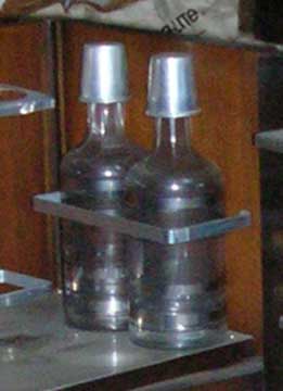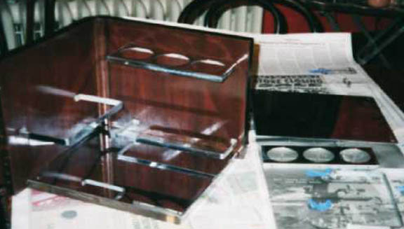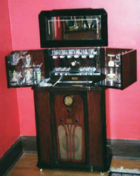 ![]() The Finished Product (2) (LEFT) Final Detail of the bar (RIGHT)Complete Radiobar, open Click to Enlarge I took one of the original glasses down to the City Market (near Gallaudet College). I found a very nice fellow who owns a used restaurant fixtures store who let me sort through several boxes of old glasses. Of all things (this was really a long shot), I actually found enough matching glasses to complete the bar. At the right is the final picture of our RadioBar. It was a thoroughly enjoyable two months of work. We will treasure our Radiobar into the future! | |||||||