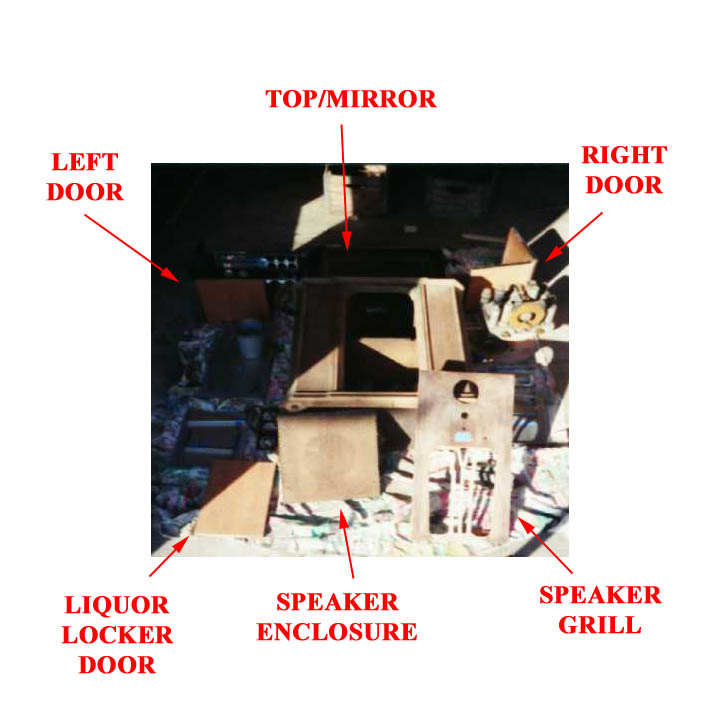 ![]() Fundamental Carpentry (LEFT) Rebuilding the plywood substrate (RIGHT) Completing the rebuilding of the plywood substrate Click to Enlarge After the substrate was restored, new veneer was applied to the speaker grille, making it completely whole. ![]() The Components of the Radiobar ...just waiting for the Finishing Process Click to Enlarge The photo above shows an "exploded" view of the entire Radiobar prior to applying new finishes Refinishing the RadiobarThe exposure to humidity had caused considerable damage to the shellac finish. At this point it is worth noting that shellac is a natural product --- it is made from the secretions of an Asian beetle. Shellac is soluble in alcohol; basically the alcohol/shellac mixture is applied to the wood, the alcohol evaporates and a thin, hard protective layer remains. The finish is durable and takes a wonderful shine. It responds well to stain and lends itself to all kinds of artistic expression. Unfortunately, shellac scratches easily and has very poor response to water. Small flaws in a shellac finish can be easily fixed by washing with alcohol --- essentially, the alcohol "re-amalgamates" the finish the shellac is dissolved and redeposited in a uniform layer. Alas, for our Radiobar, the finish had deteriorated to the point that amalgamation was not viable. Basically, refinishing consists of four phases: