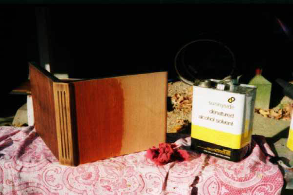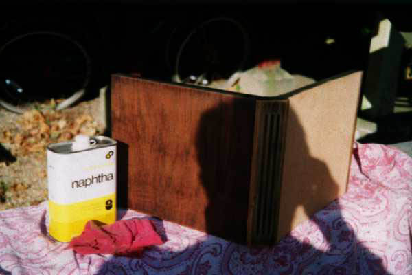 Follow along with us in this unusual process ![]() The Naphtha Wash ...removes dirt but won't raise the grain Click to Enlarge After the carpentry and sanding, there is a considerable amount of dirt on the piece. We want to get rid of the dirt before refinishing can begin. Raw wood should be cleaned with a product that will neither raise the grain nor dissolve the glue that holds the veneer. (this rules out water...) The very best wood cleaning product is Naphtha, a petroleum distillate. (Lighter fluid is mostly Naphtha) This washing process is done OUTSIDE in a well-ventilated area with ASOLUTELY NO SMOKING ALLOWED. Naphtha is EXTREMELY FLAMMABLE. It also does a fantastic job of removing all kinds of dirt and grit from down deep in the pores of the wood --- and it dissolves any grease or tar which may have gotten onto the piece. Best of all, it also gets silicone residue. This is important because NOTHING WILL STICK TO SILICONE. If there is even the slightest trace of silicone (say from furniture polish), paint, shellac, lacquer or urethane will "pucker up". Believe me, it pays to wash with Naphtha. Use rubber gloves when you do this or it will take all the oil out of your skin. The wash dries almost instantly, so you don't have to wait a long time to see results. Naphtha is fairly cheap --- about $5 worth served us very well. ![]() Amalgamating the Finish ...Alcohol is the solvent for shellac Click to Enlarge No matter how much you sand, there will always be a small residue of shellac on the piece. The best thing to do is to sand just enough to even things out -- remove the loose material and rough up the rest just a little. When the piece is cleaned with naphtha, you are ready to wash with Denatured Alcohol. (This stuff is also EXTREMELY FLAMMABLE). Take a 100% cotton rag (a piece of an old tee shirt is fine) and soak it in alcohol. Work in a small area (about four inches square.) Dribble a small amount of alcohol onto the wood and let it sit for about 20 seconds. Then begin to rub lightly with a "Figure 8" motion. Repeat until the shellac is smooth and distributed evenly. This process pays a second dividend --- when the shellac is wet on raw wood (like the new veneer), it gives you a good idea about what the final finish would looklike, absent any stain. (this is shownin the picture). When the alcohol is on the previously finished parts, you can get an idea of what kind of stain was used. For the Radiobar, this analysis indicated that the stain had tones of red and yellow in it.