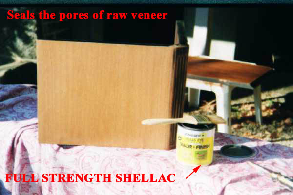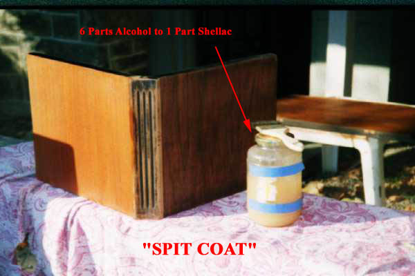 ![]() The Base for Staining (LEFT) Full Strength Shellac on New Veneer (RIGHT) Spit Coat on Old Veneer Click to Enlarge Wood varies considerably even within the same tree. In order to create a uniform color, pigments called "stains" are used. It is actually quite difficult to get a stain to penetrate evenly into raw wood. Shellac, on the other hand absorbs stain very evenly. Thus, shellac-filled pores in the wood are the base for stain. In our case, some of the wood is raw (new veneer) and some is fairly well saturated. The method for equalizing the base is to use full strength shellac on the new veneer while using a dilute mixture onthe old veneer. "Full Strength" is known in the trade as a "Three Pound Cut" --- dating back to the time when cabinetmakers mixed their own materials. One gallon of alcohol will exactly dissolve three pounds of shellac flakes making the thickest possible liquid. The photo shows the "3# Cut" ready to be applied. Always brush with the grain! The old veneer gets a more dilute coat, known in the trade as a "Spit Coat". The exact proportions are 6 parts alcohol to one part "3# Cut" Shellac. I use an old applesauce jar with the proportions of each ingredient shown by blue lines. This dries almost as you apply it! Always brush with the grain! Stain refers of various colored pigments (burnt umber, ochre, etc, etc) suspended in a solvent (e.g. alcohol, oil, water, etc.) whose purpose is to alter the color of wood while retaining other essential wood-like characteristics such as grain