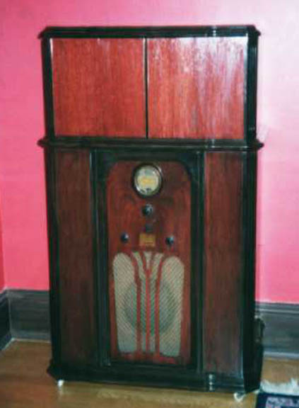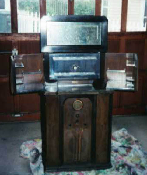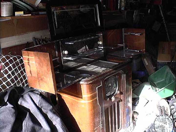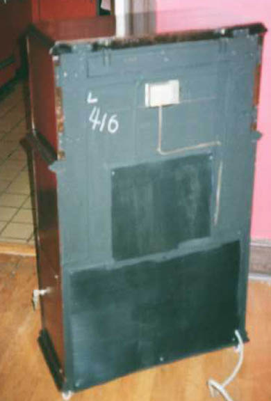 ![]() The Finished Product (1) (LEFT) Final Appearance, Front Closed (RIGHT)Appearance, Back Click to Enlarge I made a new dust cover for the radio and a back for the liquor locker. The only departure from the original appearance is a FM antenna which is hidden under black tape. I even duplicated the chalk marks on the cabinet made at the factory (They identify the cabinet as Model 416 --- the same number is stamped into all of the wooden parts)
