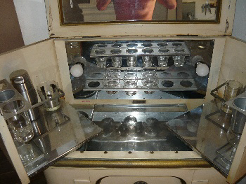 Radio Bar Photos sent in by Armand Click to Enlarge Please Send US your Radiobar pictures! We were fortunate to find all of the glassware with the object. From what we can determine, the Radiobar is complete. Alas, there is a considerable amount of carpentry, electronics and refinishing work between the state shown above and the final restored glory. We invite you to join us in this project. We'll show most of the steps involved in bringing this beauty back to life. ![]() Radio Bar Glassware Back: (l. to r.)Large Cocktail Shaker, Small Cocktail Shaker, Liquor Decanters Front (L. to r.) 5 inch Tumbler, 3 inch Tumbler, Shot Glass Click to Enlarge There are (of all things...) other articles about restoring a Radiobar on the internet.