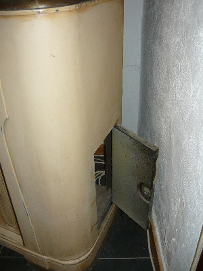 One of the interesting features of the Radiobar is the "Liquor Locker" --- most of the bottom space is empty and could serve as storage for various bottles. Access to this space is obtained through a locked door. Here is the back view --- we have removed a paperboard backing. The so called "Liquor Locker" was not all that secure. Note also how small the radio is relative to the whole.