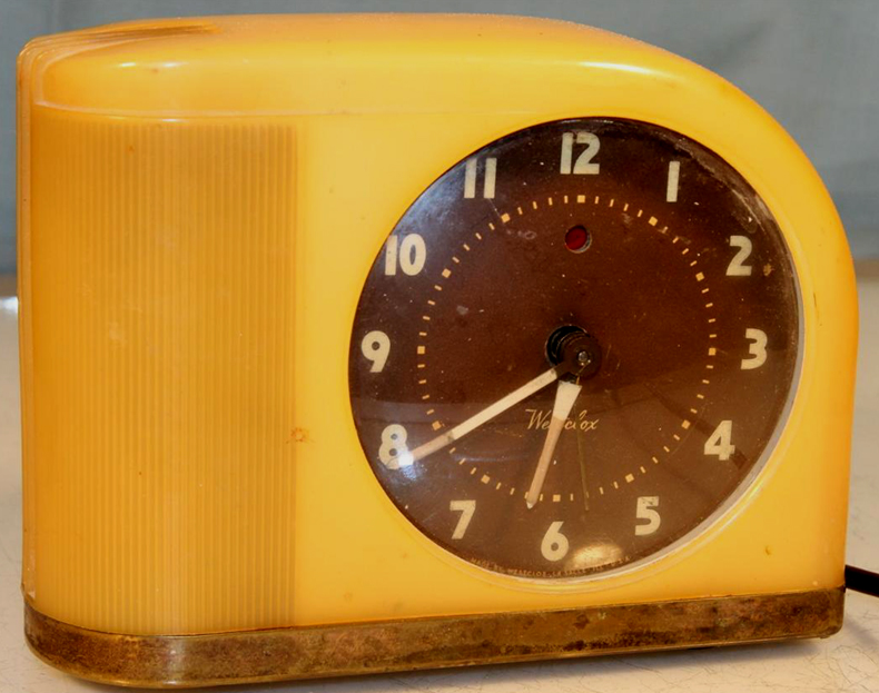 These two clocks belong to the celebrated 40s Phil of Central Indiana. Here's what Phil has to say about them: "The chrome (actually it's just pot metal that I buffed out) clock is a 'Fleetwood' made by Ingraham clock company. The dark colored set is a clock/timer/salt and pepper combo that sat on an old 'quality' stove." Click here to look at another type of collectible, or keep on scrolling for more Clocks. | |||||||