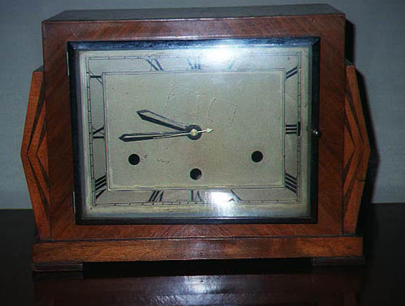We simply love the lines of this wooden Art Deco clock from the 1930s. This is the "Guaranteed Perivale Clock", manufactured by (what else) The Perivale Clock Manufacturing Company Wadsworth Road, Greenford, Middlesex (Great Britain). There is a woderful label on the inside case with a very official looking wax seal attesting to the "Five Year Guarantee", although the list of exceptions is fairly lengthy. The seal, featuring Britannia ruling the seas with her trident, reminds us that this is an "All British Clock". Perivale used the "Anvil" trademark that appears on the bottom right-hand corner of the back plate. Their clocks were initially marketed by Andrew and Co. Ltd. 67 to 68 Hatton Garden, London. The "Britannia" trademark was in use for Perivale clocks in 1937 when they were being a marketed by the Bentima Co Ltd.. The clock has a seven day movement (i.e. you have to wind it every week) and a very pleasant Westminster chime. It is very sensitive to heat (the pendulum expands and contracts) and takes a lot of regulation to keep on track. The method of regulation peculiar to these clocks appears to be somewhat complicated but it enables the pendulum length to be adjusted by means of a small lever through a slot in the dial above the figure 12. Other features include a lead pendulum and Bob encased in brass; pillars secured by nuts; barrels easily detachable by letting down the spring, and removing two screws on the strap plate without further disassembly of the movement; self-correcting chimes and provision for chime / silent. On balance, it looks a whole lot better than it works. This is one of the few examples of 1930s technology that is NOT superior to contemporary products. It would keep a whole lot better time if we threw away the "All British" works and replaced it with a $3.95 battery operated quartz movement. | |||||||