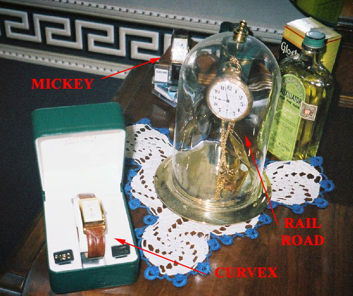 There are three Time Pieces in this picture which span the time-keeping requirements of the Swing Era --- the Mickey Mouse watch, the Curvex and the Railroad Watch Let's start with the Hamilton Railroad Watch in the protective glass bell jar. (Click Here if you want to find out why they call it a "Rairoad watch"). This particular example is a Hamilton Model 992 #7 Double Roller railroad watch with movement serial number 1,631,484 that places its date of manufacture in about 1933; the case is 10 Karat gold-filled in the "Roman Key" style;, probably from the Pennsylvania Railroad; the case serial number is 7,237,198. This watch would have been retired from railroad service in 1947 since its steel spring would be sensitive to the magnetic fields in a diesel engine. In its Original Box is a 1930s Gruen Curvex, probably the most famous wristwatch ever. These watches are one of the greatest examples of 1930s streamlined design. (Click Here to learn more about Gruen Watches) The Curvex makes Its Debut Popular Mechanics July, 1938 Click to Enlarge In the background is a Mickey Mouse Watch in the shape of a Curvex, something I find to be a fascinating juxtaposition of High and Low culture. Click Here to read about the history of the Mickey Mouse Watch, first made in 1930 by the Waterbury Clock Company (now Timex). Here is an advertisement for Elgin watches taken from the March 6, 1941 issue of LIFE Magazine that illustrates the variety of "good" watches that was available at the time. For reference, $1 in 1941 would be about the same as $20-30 in 2009, so these watches could not be considered "cheap". The Curvex was about $70, which would place it in the same category as the Rolex watch today. This does not, of course, mean that you could swap a 1941 Elgin watch for a Rolex today. ![]() Advertisement for Elgin Watches From LIFE magazine, March 1941 Click here to look at another type of collectible, or keep on scrolling for more Clocks. | |||||||
