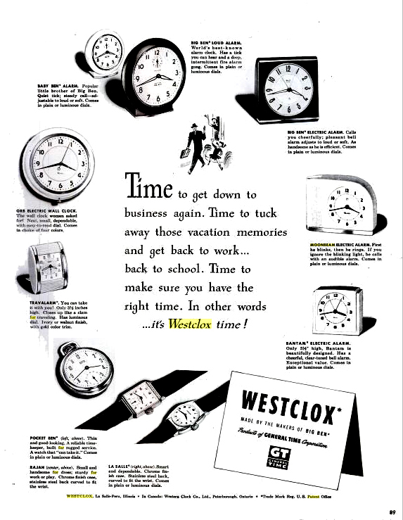![]() Henry Dreyfuss in Circles Big Ben Patent D-114,262 Honeywell Thermostat Patent D-136,850 Click to Enlarge This was sold for about a dollar in drug stores all over the country. The style evident in the design have made these a real classic, and they are now worth upward of $50 in mint condition. This example works and keeps very accurate time. Click here to look at another type of collectible. THE WESTCLOX "MOONBEAM"![]() Advertisement for Westclox Products From the September 18, 1950 issue of LIFE Magazine The Moonbeam is at about "3 O'Clock" Click to Enlarge In 1949, Westclox came out with a novel design for an alarm clock -- in addition to sound, the clock used a flashing light to gently awaken the owner. The combination light and clock was put into a very distinctive half-round case. We were surprised to learn that the "Moonbeam"was designed by Paul Darrot, having believed for years that it was designed by Henry Dreyfuss. The original moonbeam came in a white Bakelite case with a choice of a brown or white dial. It should be noted that over time, white Bakelite changes color to a caramel shade. (I have some bakelite penguins frolicing on caramel-colored ice cubes...)