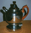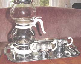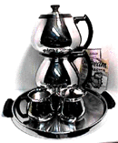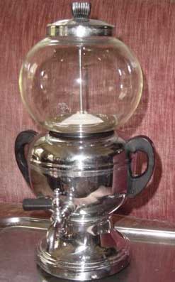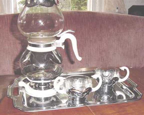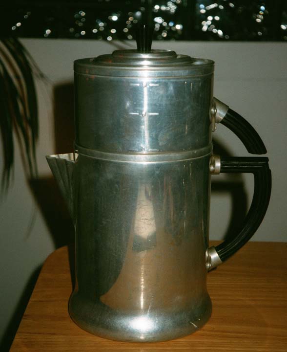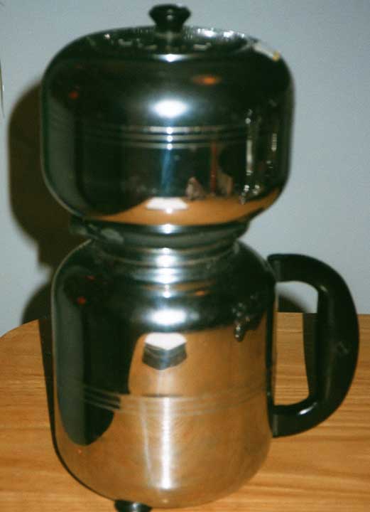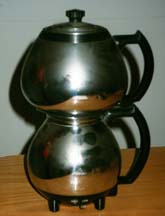 This is the Chase "Coronet Coffee Urn Service", designed by Walter von Nessen and introduced in 1938. The set includes the "Coronet Coffee Urn" (No. 17088), the Sugar and Creamer (No. 17089 and the "Festivity" Tray (No. 09018). The set sold for $28.95 in 1941, and now has a value in excess of $700. More about this may be found in Art Deco Chrome by Jim Linz (Schiffer Books, ISBN 0-7643-07444-4) P 118 This photo was sent in by the noted 40s Phil of central Indiana. Thanks, so much, Phil! Click here to look at another type of collectible, or keep on scrolling for more Coffee devices. | |||||||
