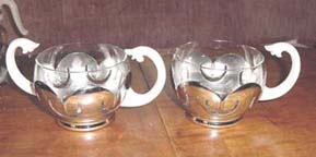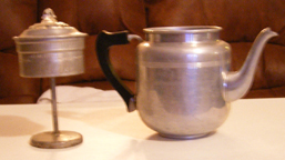 Details of the Silex Hostess Set (left)The Creamer and Sugar Bowl (Bakelite Handles) (right) The "Stove" for Heating the Water