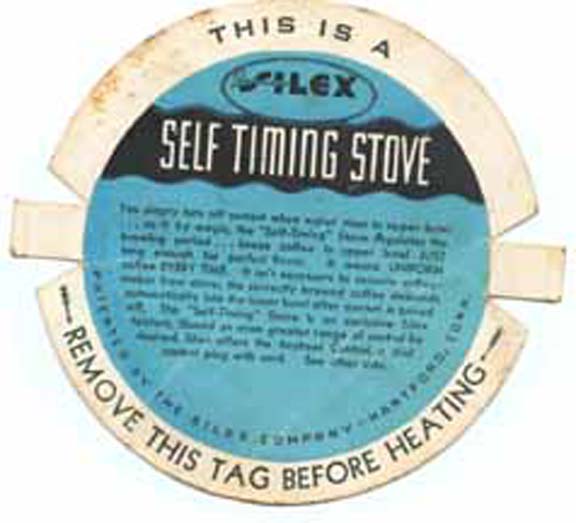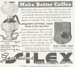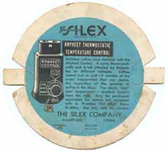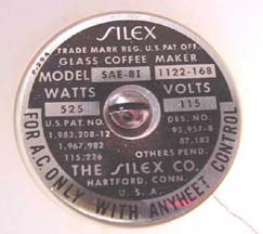 The Heat Control (left) The ANYHEET Control (middle) An Ad for The ANYHEET Control from 1935 (right) The Manufacturer's Nameplate Click to Enlarge The reader who sent us these photos tells us: "..The Silex Hostess set was purchased (for $240.00) by the Connecticut State Historical Society. In the spring [of 2006] it will become part of a long term exhibit in the Old State House in Hartford, CT where it was made..." Contact Us if you can help us know more about this fascinating object. Here are some photos of a very lovely Silex vacuum coffee brewer sent in by our reader Kevin. He did a good job with the photos and even scanned in the brochure!