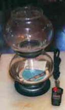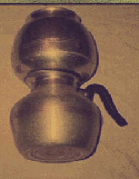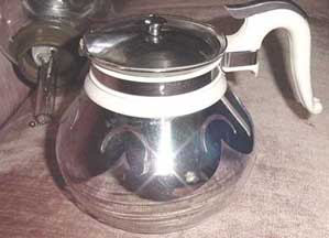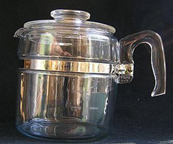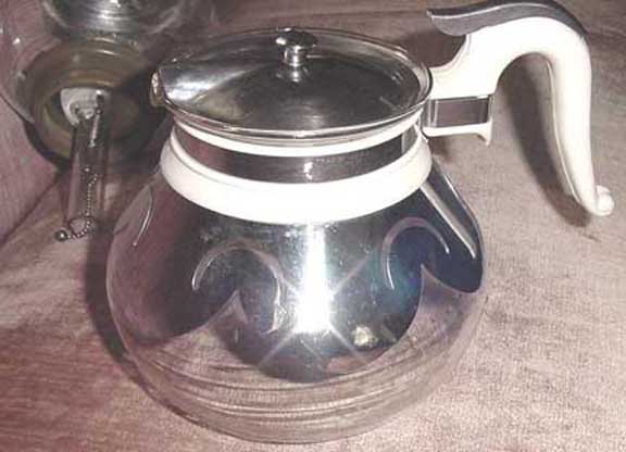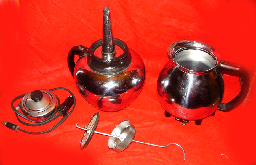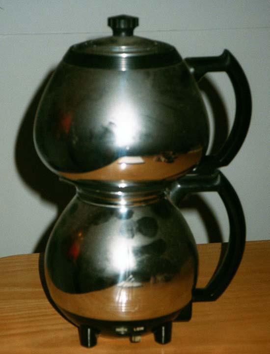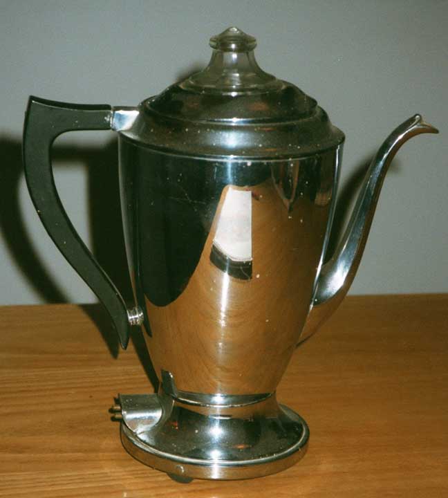 The Unusual Plug Arrangement If you buy one, make sure that you get this! Click to Enlarge Click here to look at another type of collectible, or keep on scrolling for more Coffee devices. Royal Rochester Percolator PERCOLATOR Method -- Automatic Click to Enlarge As percolators go, this is more-or-less the classic. It is designed to look like a seventeenth century Georgian silver coffee server. It is made of stainless steel. One of the commercial advantages of the percolator system is that they could be camouflaged to look like elegant silver pieces. The brewer is also the server. All of the other systems impose very specific design requirements and are somewhat inconvenient in that they have to be dis-assembled prior to serving. The percolator is "all in one piece" and enjoyed considerable popularity due to this simplicity. Here is the Manufacturer's information: Royal Rochester 110-120V 410 W Robeson Rochester Corporation Rochester, New York The Pyrex Flameware Glass Percolator PERCOLATOR Method -- Manual Click to Enlarge We'd like to thank our reader Candy Eve from Newbury Park, CA for compiling these directions on how to use the PYREX FLAMEWARE COFFEE PERCOLATOR INSTRUCTIONS FOR BREWING AND CLEANING Our thanks to Candy -- here is an ad for the Pyrex Percolator that shows some of the various sizes available. You can still buy these percolators. The Pyrex Flameware Glass Percolator PERCOLATOR Method -- Manual Click to Enlarge Click here to look at another type of collectible, or keep on scrolling for more Coffee devices. | |||||||