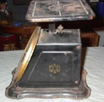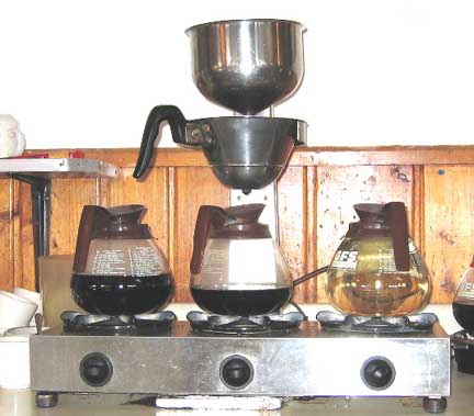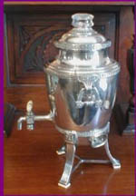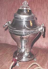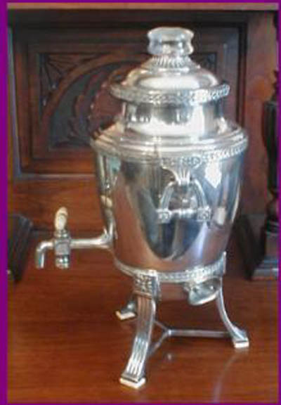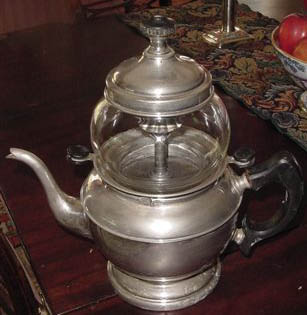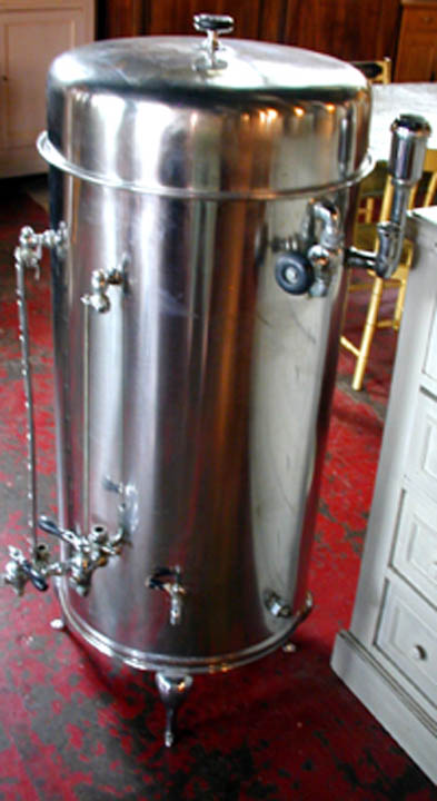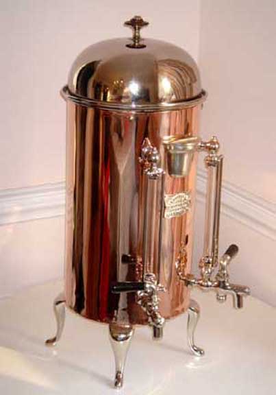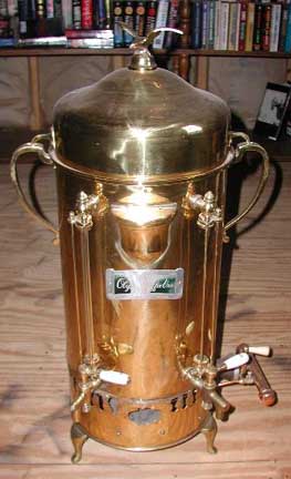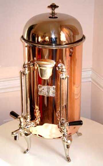 The Taft-Warren &Taft Commercial Coffee Urn Click to Enlarge Eric writes: "... I've attached a few images of a Taft, Warren, & Taft coffee urn that was produced in the early 1900s. Taft, Warren & Taft was a Baltimore-based firm, long since defunct, that supplied Baltimore and Washington, DC hotels with restaurant supplies, including coffee urns, beginning around 1912. (That is when they showed up in the State of Maryland's Comptroller's tax records.) The urn shown is one from my private collection and is slated to show in a proposed exhibit onBaltimore wares at the Baltimore Museum of Industry. All of these urns wereoriginally nickel-plated top-to-bottom. Now you see them only as copper and brass as the nickel wore over time, and owners opted to have the remainderremoved. I fully refinish my urns, plating all of the hardware, thoughleaving the copper chassis unplated. I happen to like the two-tone,three-tone look. Several of our urns get used for family functionsincluding tailgate parties, clean-up well, and are always the subject of attention by coffee lovers. ..." In conjunction with Eric's note, we also received a photo of thus brass beauty, sent to us by John, one of our readers. He says that he picked this up in the Phillipines and that the only markings on it indicate that it was made in Osaka, Japan during the period when the United States occupied that country after World War II. John says, "...Brass that might have ended up in shell casings and steel that might have been part of a "Zero" have been re-fashioned into a very beautiful and elegant object, hopefully a metaphor for our times... ![]() Coffee Urn Manufactured in Occupied Japan Unfortunately, Eric, the Urn expert has this to say: :...Now, regarding the coffee urn that one of your readers indicated was made in occupied Japan (O-J), I do have to take exception. It is an interesting story, however, I don't believe it is correct. There were a number of U.S. manufacturers of coffee urns that were in production between 1885-1935 that produced this style of coffee urn (i.e., gas heated, ceramic insert for coffee, copper water jacket for heated water). Such urns ranged from 11-12" diameter to as large as 20-22" diameter (over 4 feet tall!). (I have one of the large ones in my basement, and my contractors often mistake it as an old water heater!) Now, regarding the O-J urn, I believe that the two wire handles on the sides were a later embellishment, as was the eagle on the top (to mimic an Italian espresso machine of the 1930s). Additionally, post-WII urns had moved largely to aluminum in construction. It is possible that the urn ended up in the Philippines in a nice hotel, however, I am almost certain that it was shipped from the U.S. pre-WWII. Additionally, I recognize the chassis of the urn and will try to identify the manufacturer at a later date. Likely it came from either New York or Chicago. ..." Our reader Alyse sent us a picture of this beauty: ![]() The Filtrator Coffee Urn Thanks to our Reader Alyse Click on the Photo to Enlarge it Alyse writes: ... I purchased this in rural Indiana a few years ago. It is in very good shape and clean inside out The plate inside says FILTRATOR COFFEE APPARATUS CO.INC N.Y. CITY I think it can brew 50 gallons ... On the subject of commercial brewers, you might want to look at our page on Diner Talk, since a whole lot of the coded communications between waitstaff and the kitchen involves coffee. feel free to Contact Us if you can help us know more about either of these fascinating objects. Click here to look at another type of collectible, or keep on scrolling for more Coffee devices. | |||||||