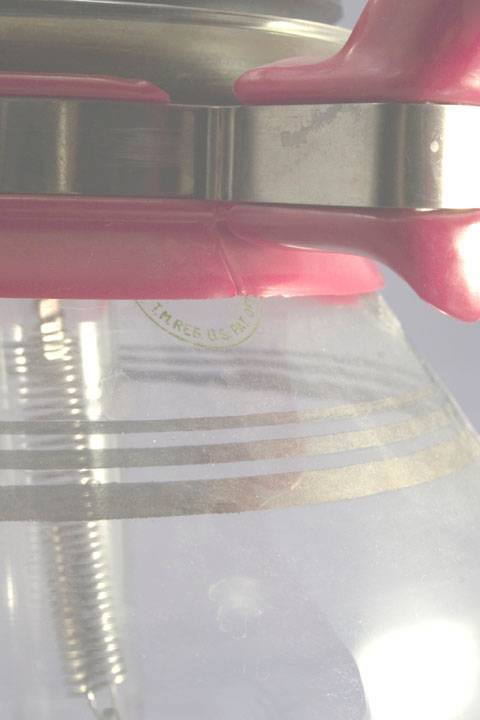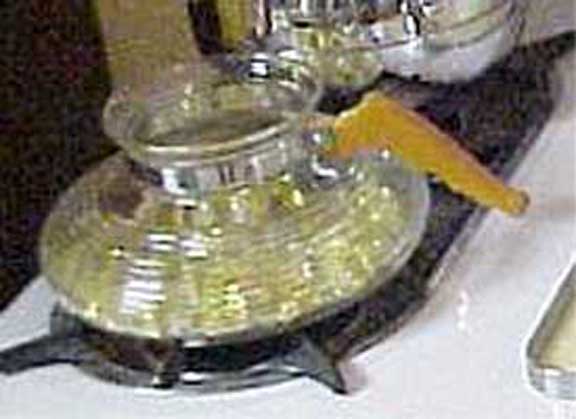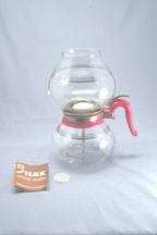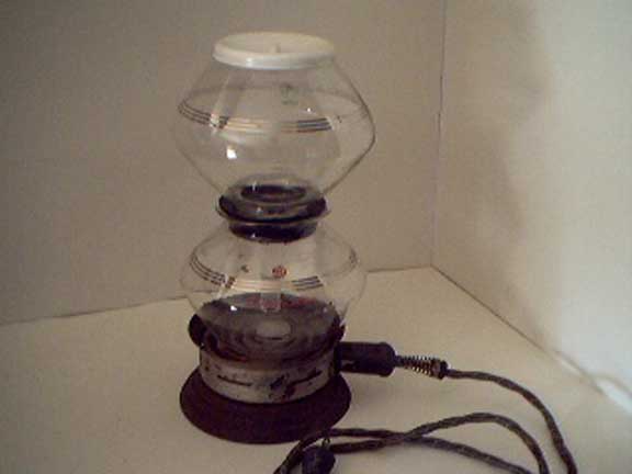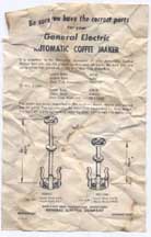 Instructions for the GE Vacuum Coffee Maker Click to Enlarge We have had some exchange of comments with our readers about problems with the GE 129P8. Here's what Phil has to say: "...[I think] that the GE 129P8 is the coolest glass vacuum coffee maker ever. I have two of them and they are both in "like new" condition. After [discussing this with a reader] I got the hankerin' to make some coffee with one of my 129P8s. I discovered that neither one of them works. When plugged in, the pilot light comes on but when the red button is pushed the pilot light stays on and nothing happens. I have a feeling that the magnetic trigger in these coffee makers did not last long. That explains why my GEs are in such excellent condition ... they quit working early in their lives so were not used much. I have an extra stove (heating unit) for a GE 129P18 (that is the post WW II GE model which is a face-lifted 129P8). That stove does not work correctly either. I did get it to go on 'Hi' heat by holding the button down with my finger. I ran it through a coffee making cycle (using just water - no coffee) and discovered another good reason not to use these GEs for making coffee. The boiling water and steam in the upper bowl caused the bakelite lid to give off a burnt bakelite odor and that odor was present in the cloth coffee filter when I cleaned the coffeemaker after the experiment. Also, one of the rubber feet on the upper bowl lid stuck to the inside of the bowl during the test run. If you do get your 129P8 working, I would recommend that you leave the lid off while making coffee. I'm going to try to dis-assemble one of the 129P8 stoves to see if I can get it working properly. ..." Thanks, so much, Phil! Here are some photos of another high-style GE Vacuum coffee maker sent in by our friend Leon