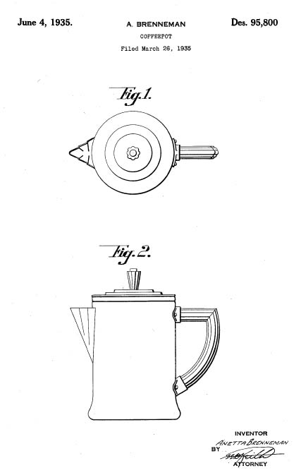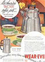 This coffee maker is eminently collectible for the cylindrical shape and the "Dee" shaped handle. This utensil employs a paper filter in conjunction with the metal filter. I was very fortunate to find this as new old stock --- I have the original cardboard sleeve with the initial price ($0.75) written in black crayon. The piece dates from June of 1935 when the original design patent was issued. The manufacturer's information states: Wear-Ever Made in USA PAT D-95799, PAT D-95800 This particular coffee maker was designed by Anetta Brenneman of TACU; a reproduction of her design patent drawing is shown above Wear-Ever got started near Pittsburgh, Pa. Aluminum, a new material, began to be seriously used as cookware as early as the 1890s when it was cast and stamped. Among the first manufacturers were the Pittsburgh Reduction Company which became U.S. Aluminum Company (USAC), and then the Aluminum Company of America (ALCOA). (Wagnerware and Illinois Pure Aluminum Co. were also manufacturers of aluminum cooking products at this time.) In 1901, USAC formed "The Aluminum Cooking Utensil Company" (TACU), as its marketing subsidiary. In 1904 TACU adopted "Wear-Ever" as its trade name. These products won a prize at the St. Louis World's Fair, and in 1912, Wear-Ever aluminum utensils became standard issue for the U.S. Marine Corps. By 1925, USAC had become ALCOA and Wear-Ever became the name for TACU. If the mark says "USAC", the piece is from before 1901; if it says "TACU" it's between 1901 and 1925; if it just says "Wear-Ever" it's after 1925. We note that Anetta Brenneman identified herself as an employee of TACU. Wearever Coffee Pots "The Coffee Pot that Went to College" DRIP METHOD NOT Automatic Click to Enlarge Above is a 1940s ad for Wearever products, including our little drip coffee maker. The motto is "The Coffee Pot that Went to College". Click here to look at another type of collectible, or keep on scrolling for more Coffee devices. | |||||||